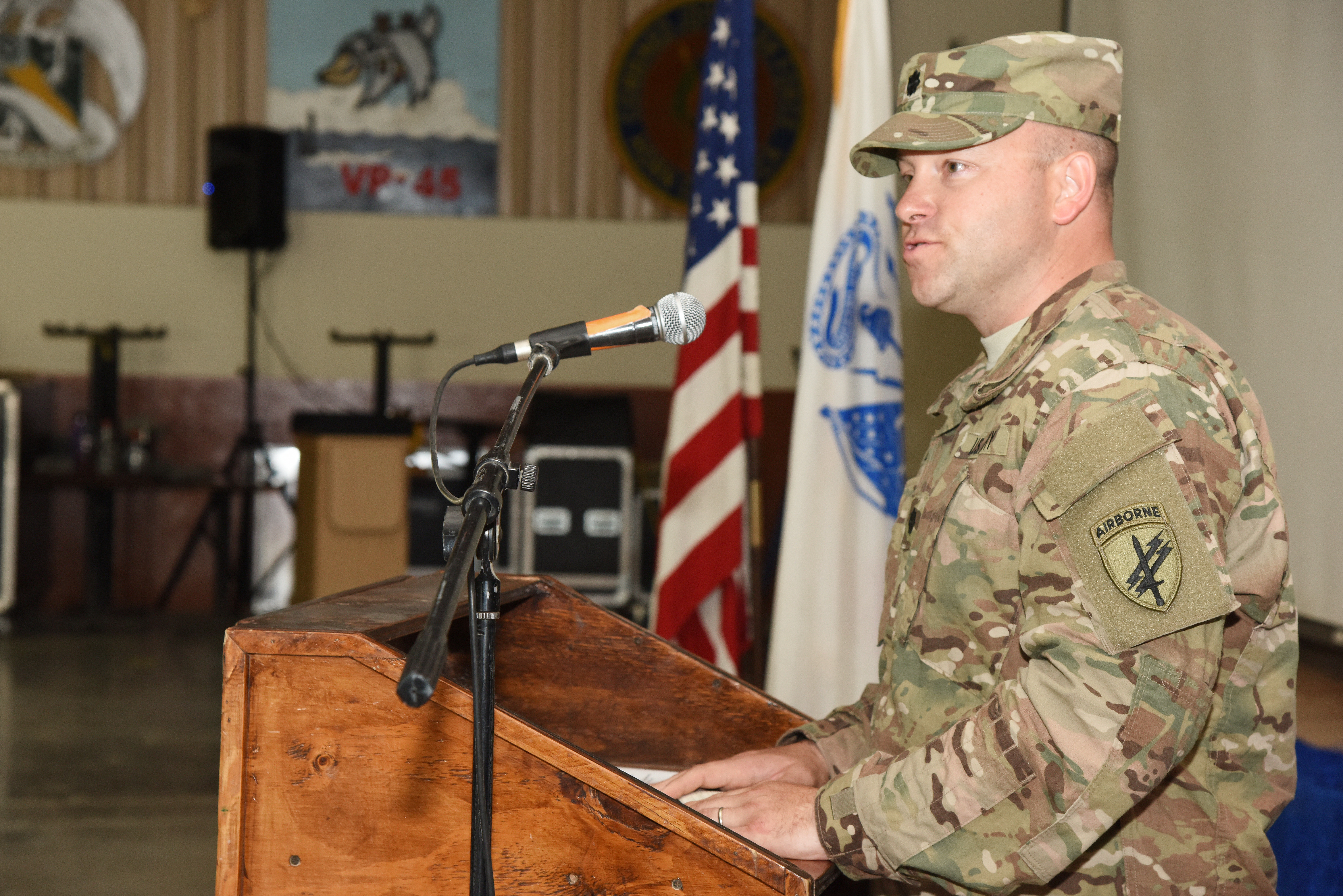 U.S. Army Lt. Col. Gerry Dolan, 415th Civil Affairs Battalion commander, addresses soldiers at a transfer of authority ceremony June 22, 2015, in Djibouti. The 415th CAB soldiers will take over the responsibilities and tasks that the outgoing CAB performed during their time assigned to Combined Joint Task Force-Horn of Africa. (U.S. Air Force photo by Staff Sgt. Maria Bowman)