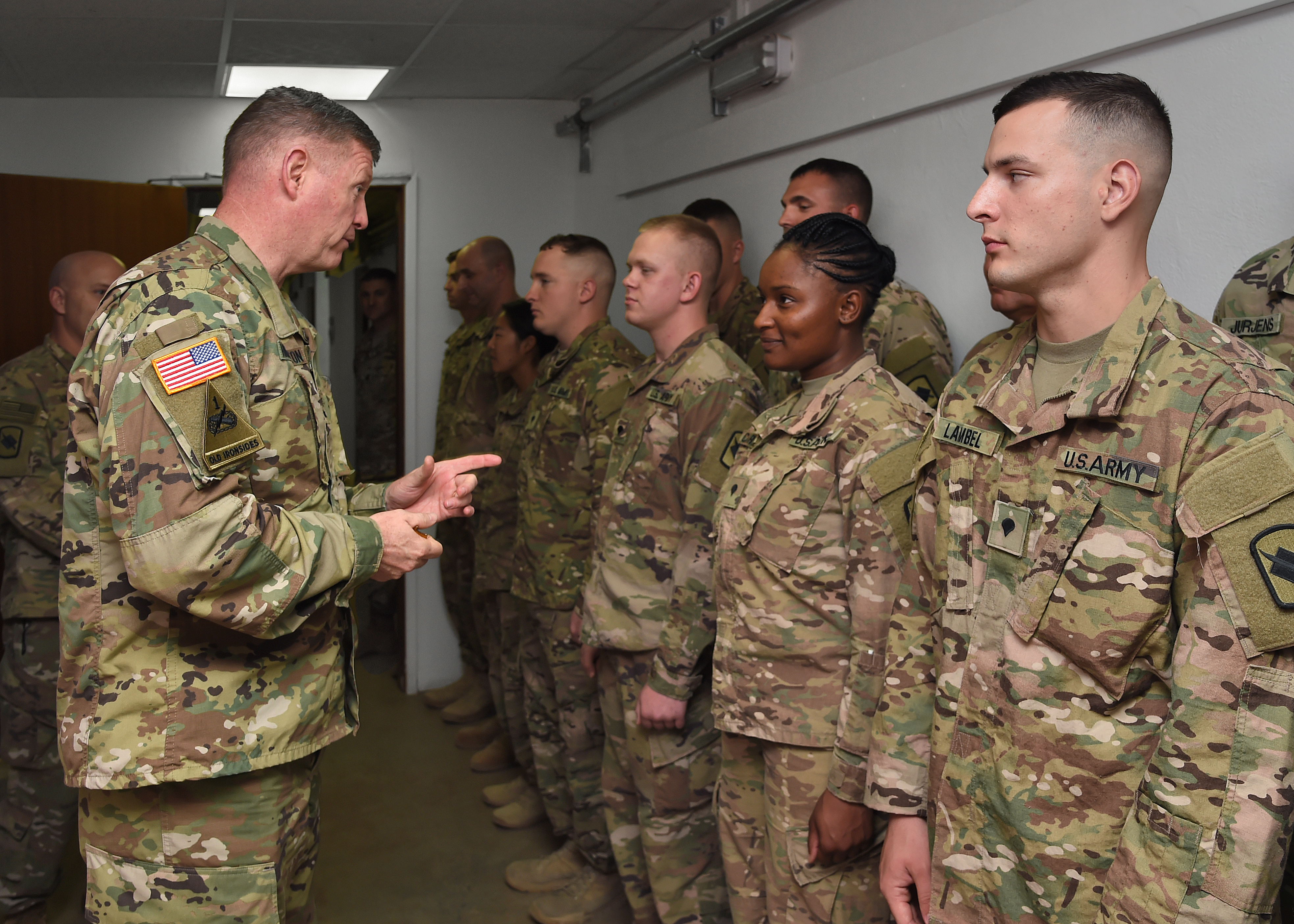 U.S. Army Maj. Gen. Joseph Harrington, commanding general of U.S. Army Africa visits with infantry and civil affairs Soldiers assigned to Combined Joint Task Force-Horn of Africa at Camp Lemonnier, Djibouti, March 22, 2017.