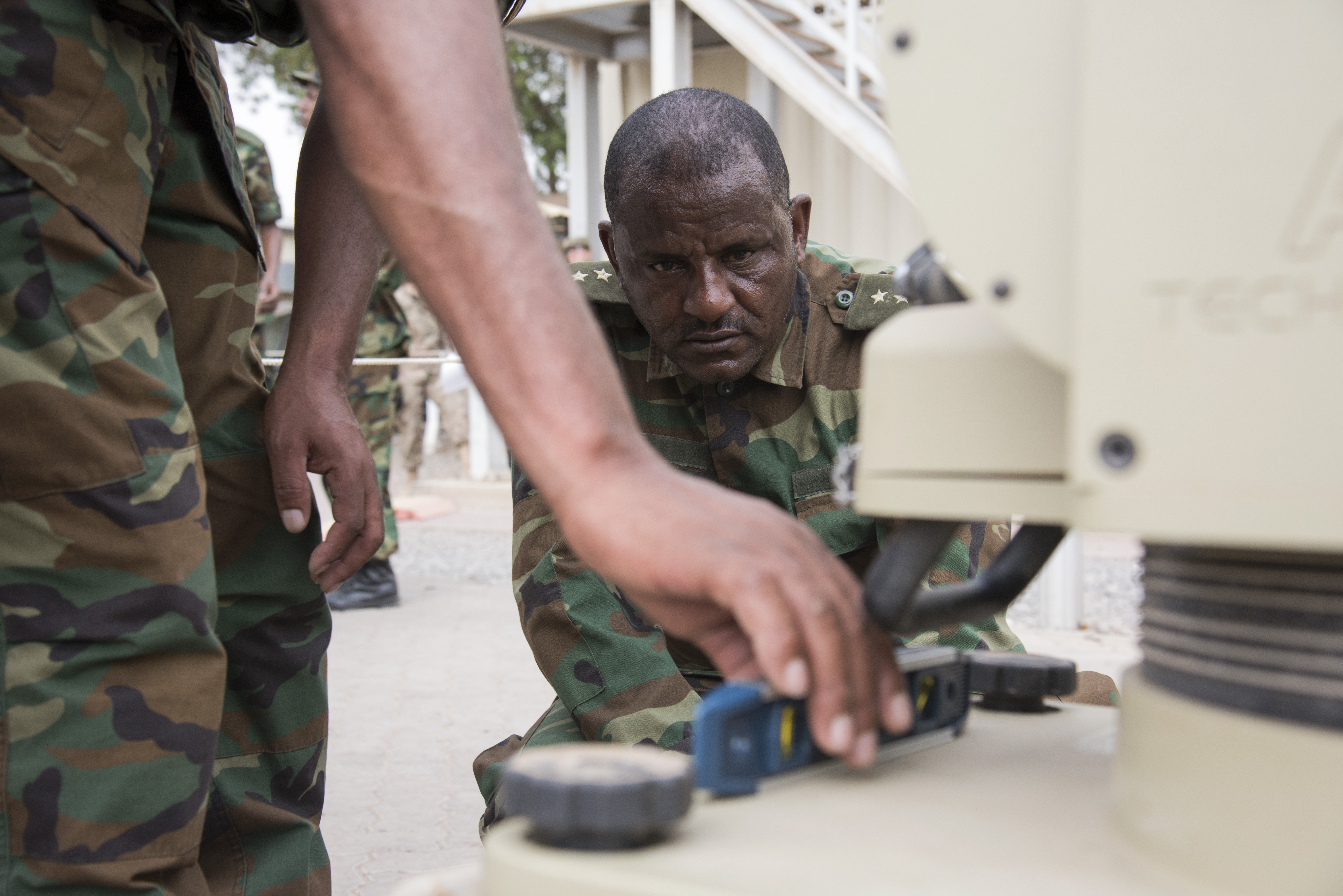 Members of the Ethiopian National Defense Force (ENDF) level the body of a U.S. Africa Command Data Sharing Network (ADSN) terminal at Camp Lemonnier, Djibouti, Aug 18, 2015. ENDF personnel were tested on how quickly they could setup and tear down the field communication system as part of a multi-week ADSN course designed to broaden communication interoperability between host nation security forces, which was hosted by communications and intelligence personnel assigned to Combined Joint Task Force-Horn of Africa. (U.S. Air Force photo by Staff Sgt. Nathan Maysonet/released)