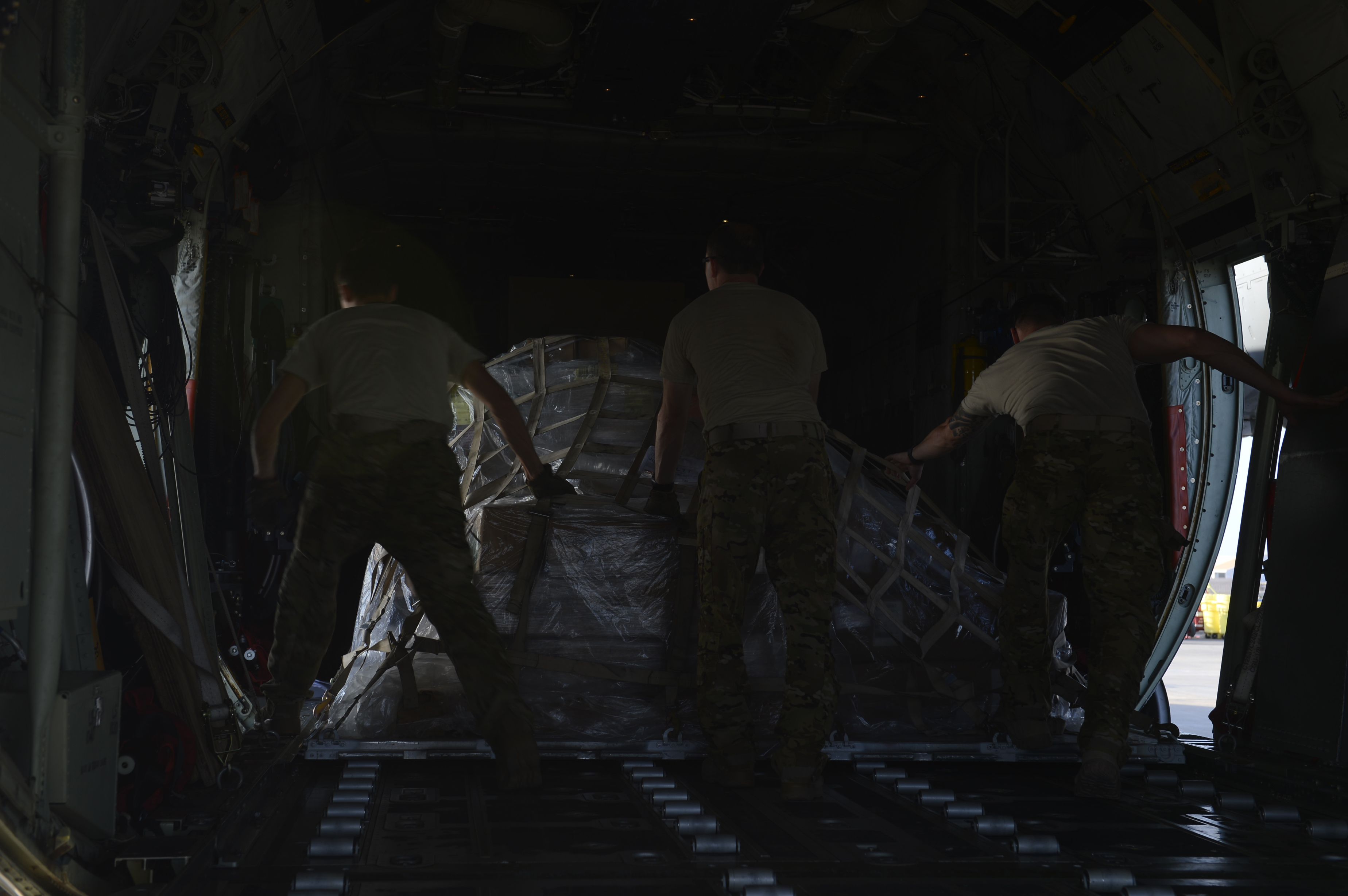 Airmen from the 75th Expeditionary Airlift Squadron push a pallet of equipment into a C-130J Super Hercules Nov. 24, 2015, at Camp Lemonnier, Djibouti. The flexible design of the C-130J enables it to be configured for many different missions, including airlift, air-ground and aeromedical evacuation. (U.S. Air Force photo by Senior Airman Peter Thompson)