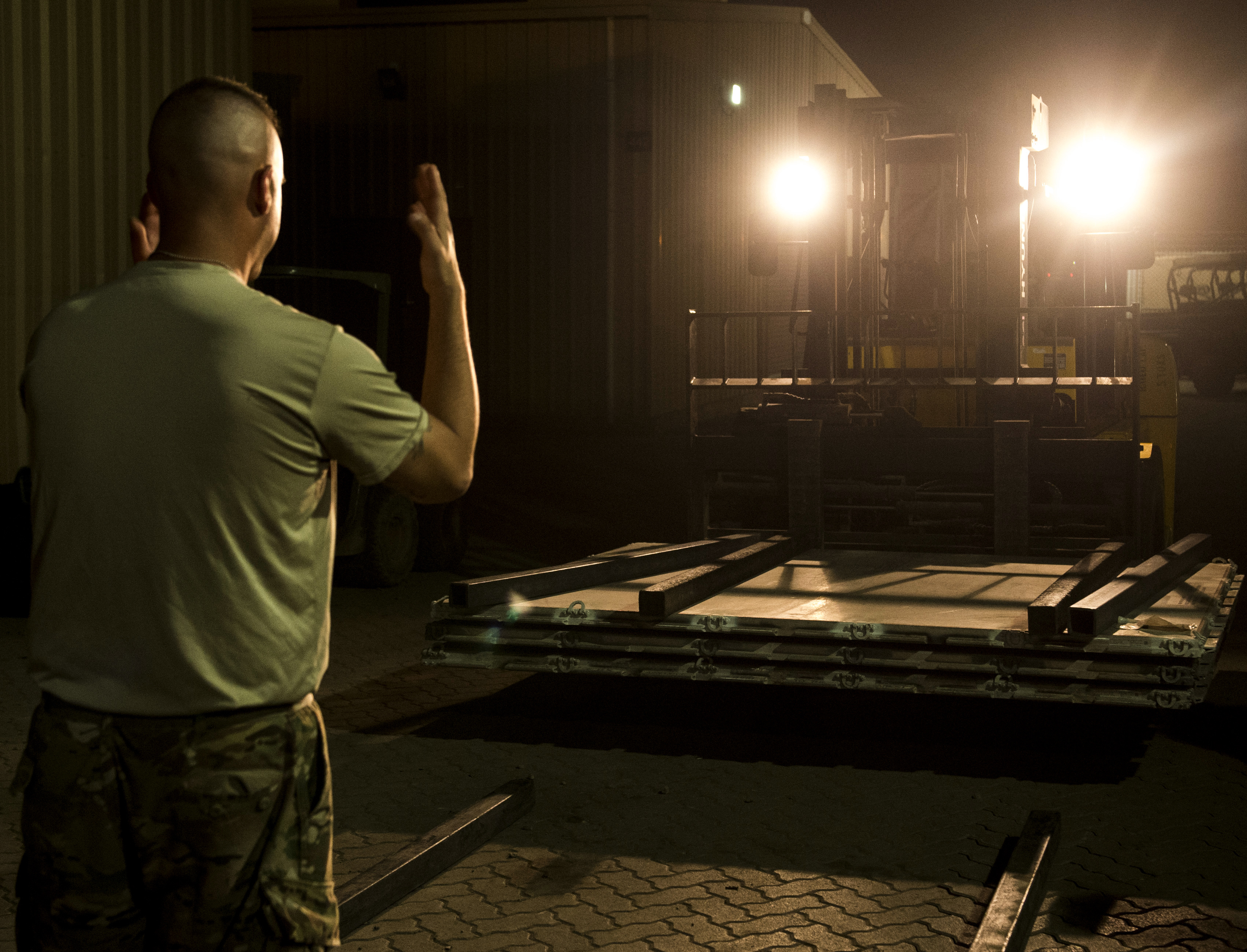 A U.S. Army Soldier from Bravo Company, 3rd Battalion, 15th Infantry Regiment, directs a forklift Feb. 13, 2016, at Camp Lemonnier, Djibouti. After being recalled in the early hours of the morning to validate the East Africa Response Force’s rapid response ability, EARF members gathered and immediately began by prepping personal gear and equipment. Shortly after, teams began building pallets with all the necessities for self-sustainment and mission accomplishment. (U.S. Air Force photo by Senior Airman Peter Thompson)