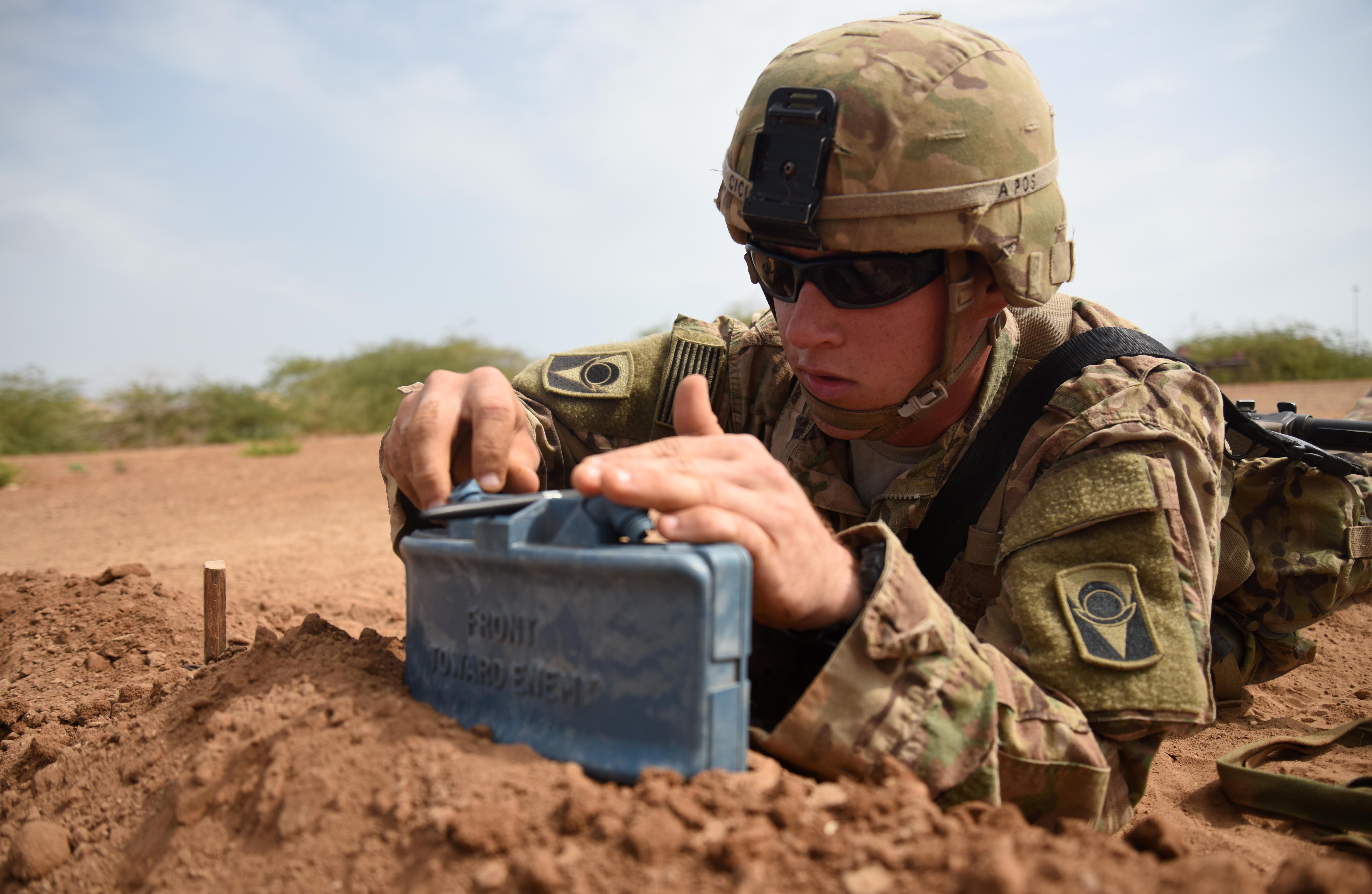 U.S. Army Spc. Jeremy Cicio, Expert Infantry Badge candidate, performs a mortar test March 29, 2016, during the weapons portion of the EIB course at Camp Lemonnier, Djibouti. The weapons portion involved a variety of systems and required proficient knowledge of preparing each weapon for use, all of which were timed. (U.S. Air Force photo by Staff Sgt. Kate Thornton)