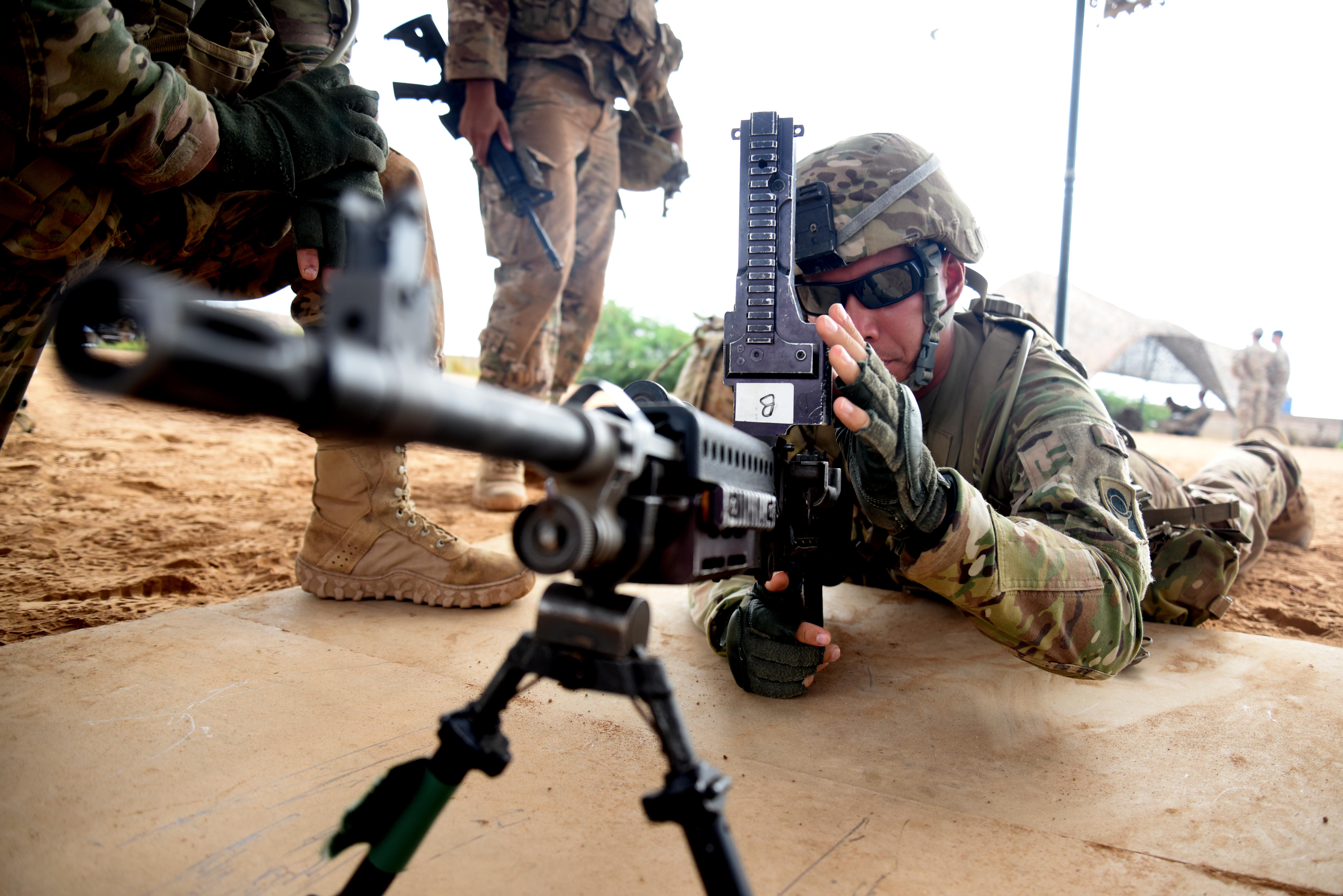 U.S. Army 1st Lt. Alexander Repp, Expert Infantry Badge candidate, practices before approaching the testing tent March 29, 2016, during the weapons portion of the EIB course at Camp Lemonnier, Djibouti. As they moved through each day and each test, they received a “go” or “no go” indicating their status. (U.S. Air Force photo by Staff Sgt. Kate Thornton)