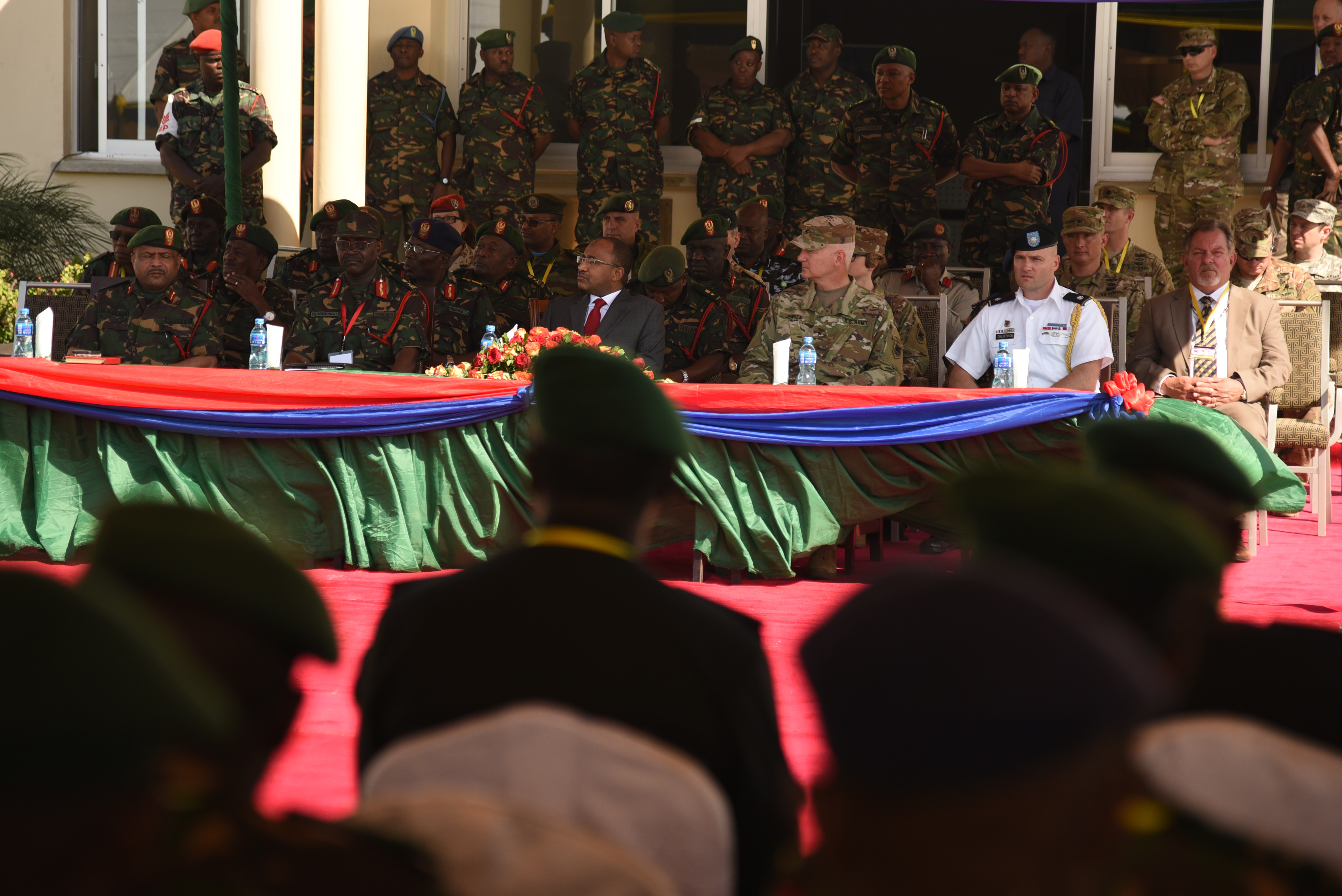 DAR ES SALAAM, Tanzania – Eastern Accord 2016 participants attend the Opening Ceremony to commence the command post exercise at the Tanzanian Peacekeeping Training Centre, July 11, 2016, in Dar es Salaam, Tanzania. EA16 is an annual, combined, joint military exercise that brings together partner nations to practice and demonstrate proficiency in conducting peacekeeping operations. (U.S. Air Force photo by Staff Sgt. Tiffany DeNault)