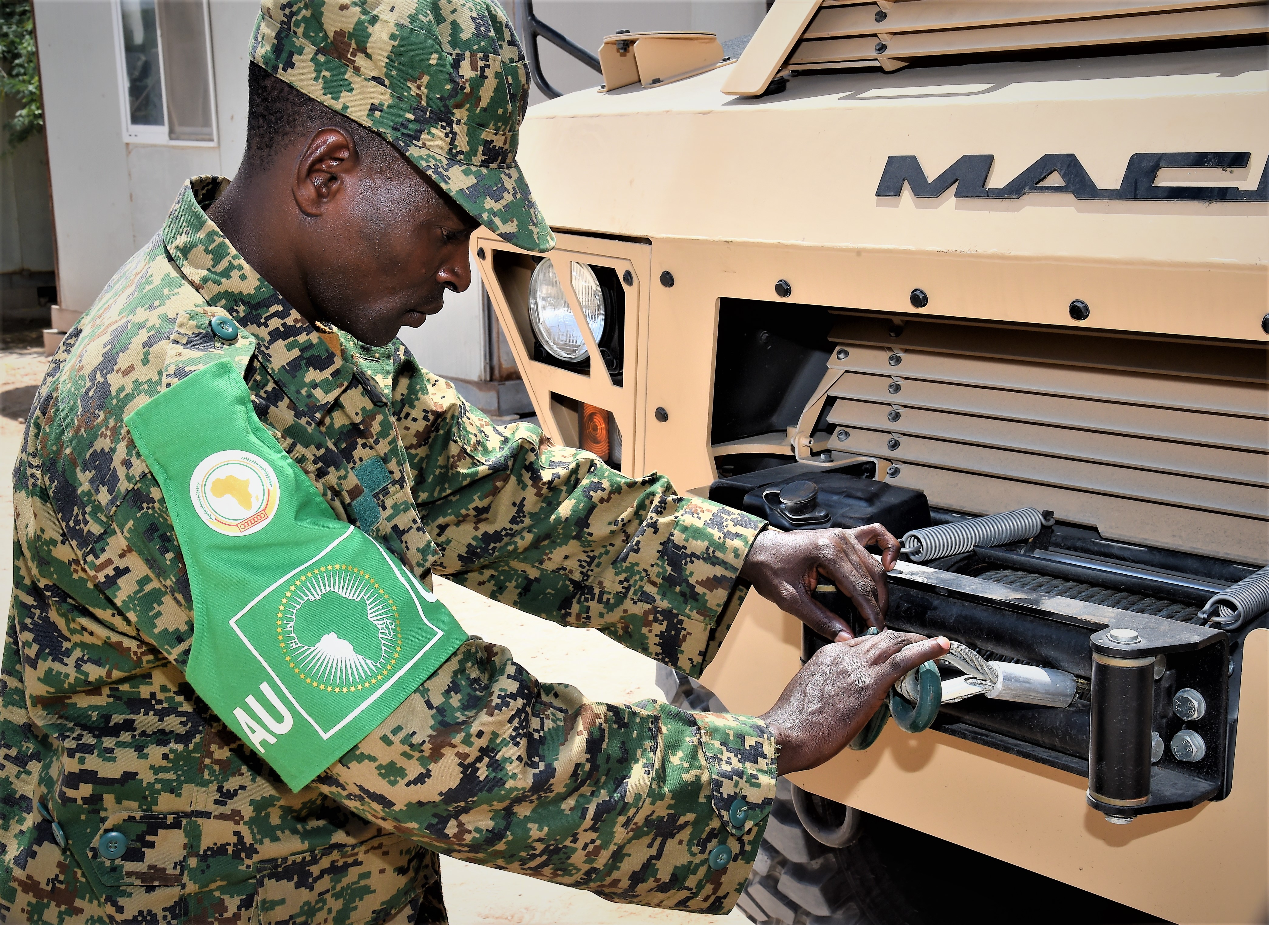 A member of the Uganda People’s Defence Force (UPDF) reviews one of the nearly 20 armored troop carrying vehicles provided by the U.S. Department of Defense and Department of State at the UPDF compound, Mogadishu International Airport, Somalia, Sept. 25, 2017. Members of U.S. Africa Command and Combined Joint Task Force-Horn of Africa’s Mogadishu Coordination Cell synchronized efforts with their UPDF counterparts to deliver necessary assets for the African Union Mission in Somalia. (U.S. Air National Guard photo by Tech. Sgt. Andria Allmond)