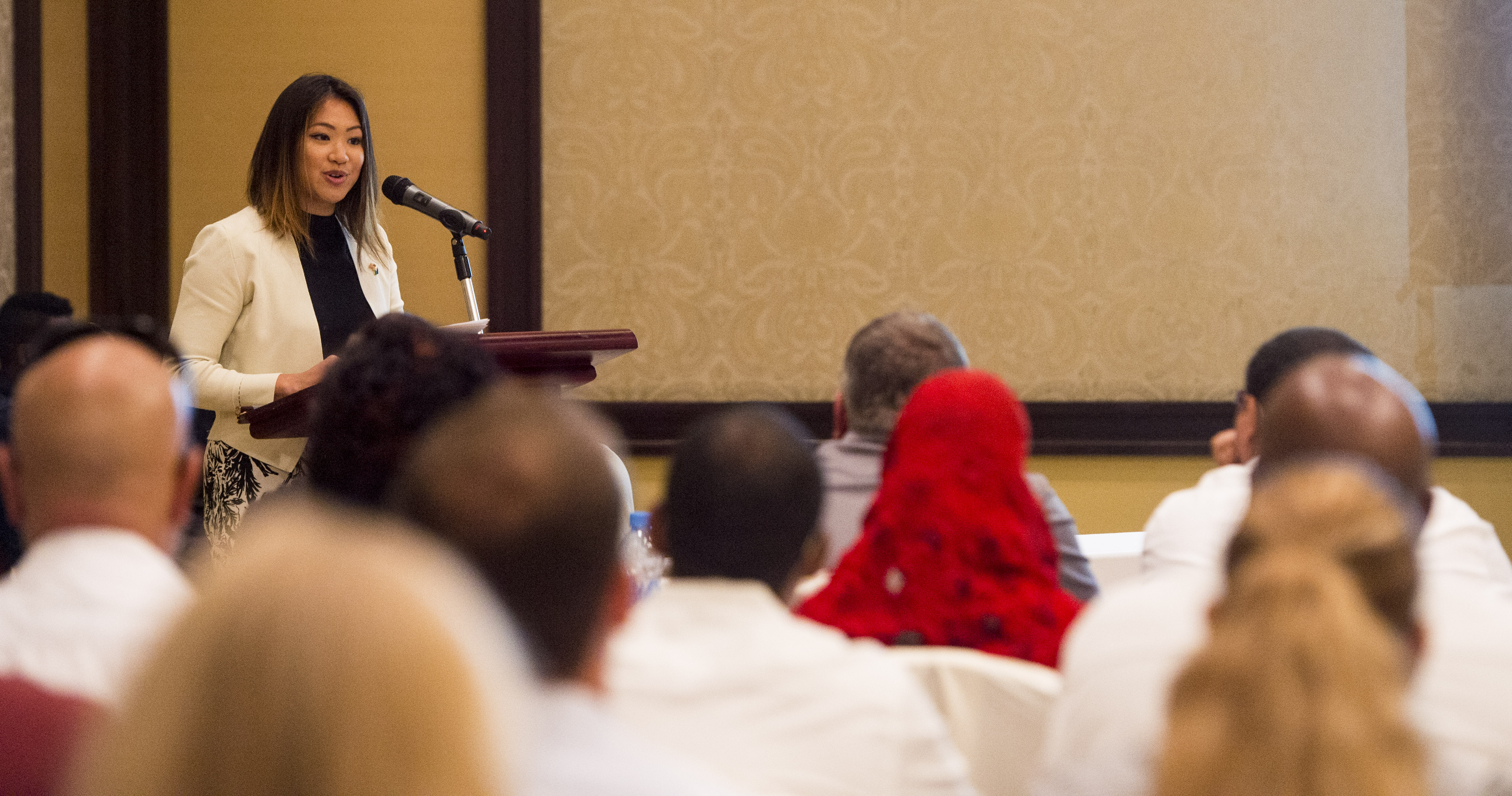 Merry Walker, U.S. Embassy Djibouti Economic and Commercial Officer, gives her opening remarks during an Economic Outreach Symposium held at the Kempinski Hotel, Djibouti, Dec. 19, 2017. Hosted by the Combined Joint Task Force - Horn of Africa Contingency Contracting Office and commonly referred to as Vendor Day, the symposium is designed to bring local business owners together and inform them of the opportunities and processes of doing business as a vendor with the U.S. government. (U.S. Air Force photo by Staff Sgt. Timothy Moore)