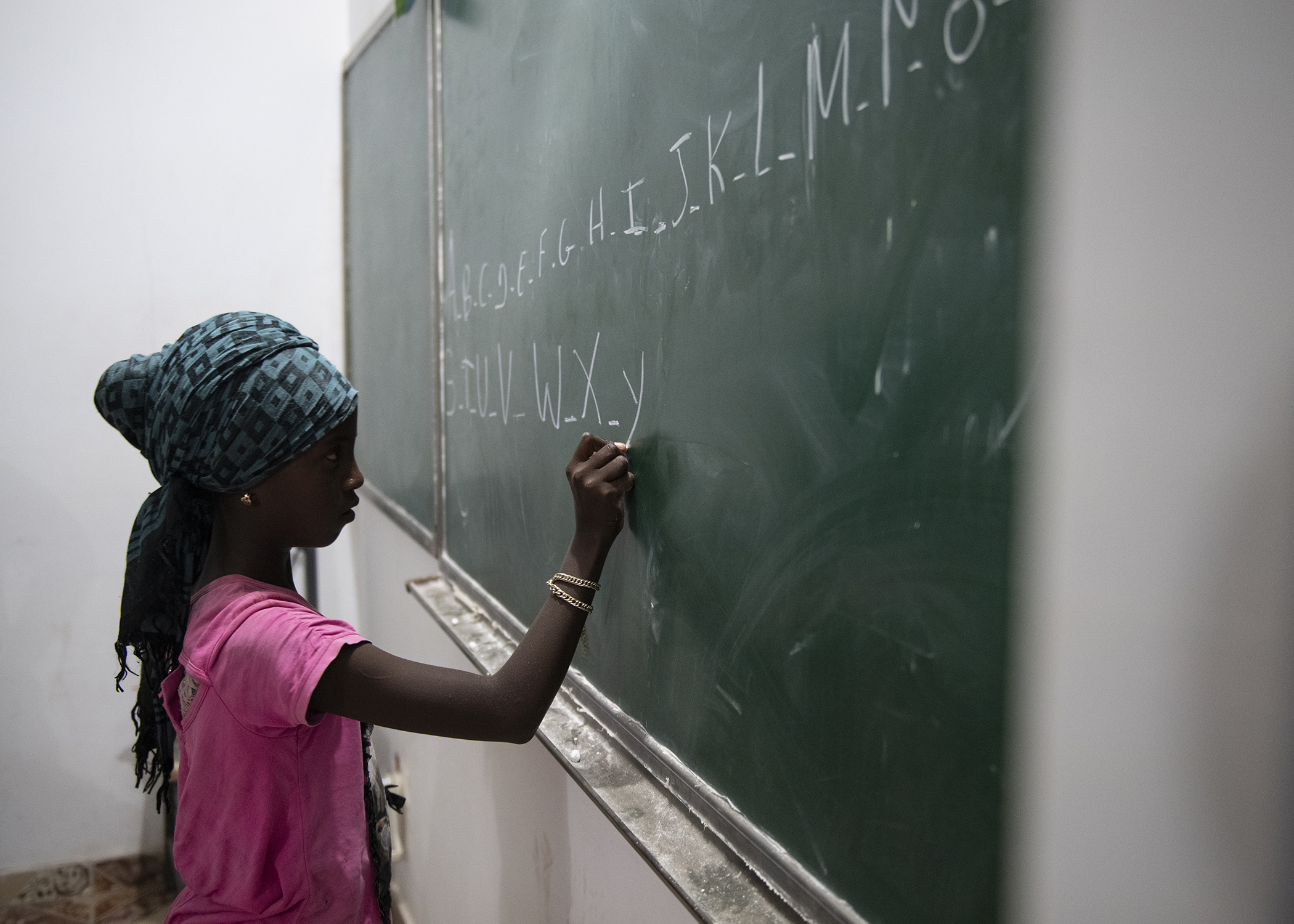 A child writes the alphabet during an English Discussion Group led by U.S. Army Soldiers from the 404th Civil Affairs Battalion, assigned to Combined Joint Task Force-Horn of Africa, in Tadjourah, Djibouti, Feb. 12, 2019. More than 90 Djiboutian youth and adults attended the group where students develop practical linguistic and rhetorical skills through conversation with English-speaking U.S. service members. (U.S. Air Force photo by Tech. Sgt. Shawn Nickel)