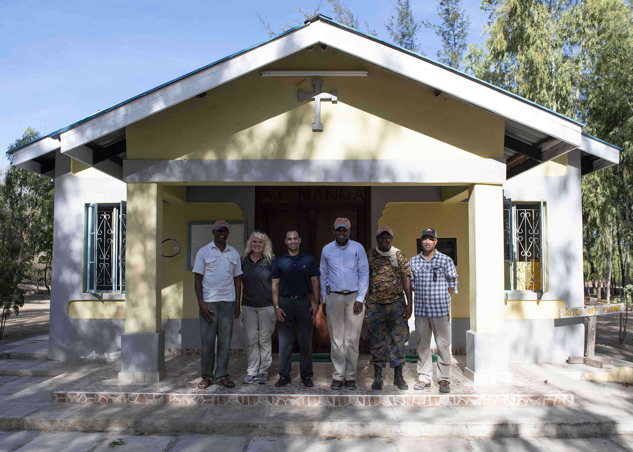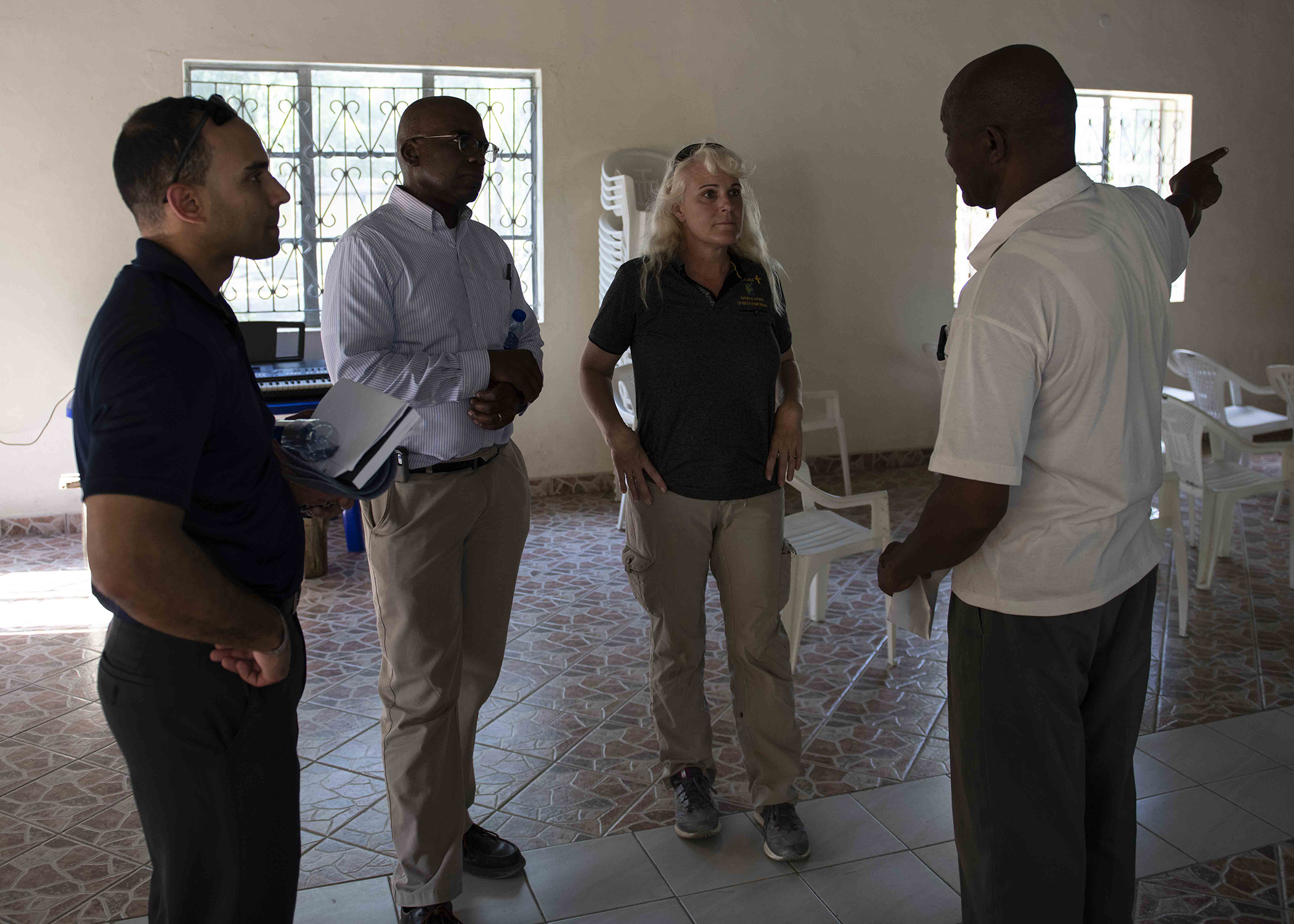 Kenya Navy Service Warrant Officer (Rev.) John Mutia Syanda, right, a senior chaplain at Kenya Navy Compound Manda Bay, gives a tour of his chapel to visiting chaplains April 26, 2019. Massachusetts National Guard chaplains visited Kenya as part of the State Partnership Program, which is a National Guard program that is a force multiplier aimed to build partnerships on many levels of assistance such as training, legal, logistics, religious affairs, medial and many other fields in military operations. (U.S. Air Force photo by Tech. Sgt. Shawn Nickel)