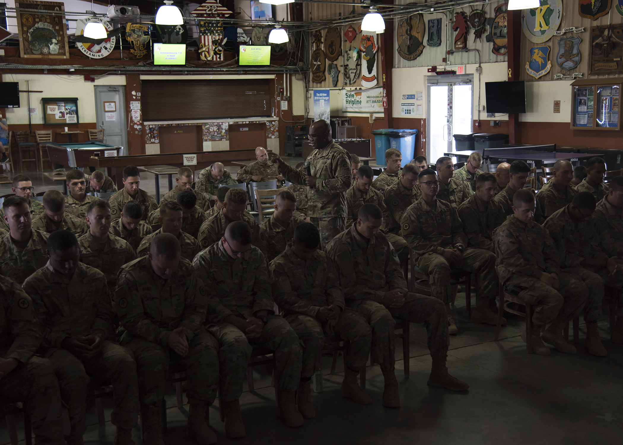 U.S. Army Col. Paul Minor, chaplain with the Massachusetts National Guard, speaks to U.S. Soldiers from the Massachusetts National Guard deployed to Combined Joint Task Force-Horn of Africa (CJTF-HOA), during a battlefield circulation at Camp Lemonnier, Djibouti, April 25, 2019. Minor met with more than 80 Massachusetts National Guard Soldiers assigned to, Charlie Company, 1st Battalion, 181st Infantry Regiment, mobilized to support Task Force Warrior, prior to visiting Kenya, which is Massachusetts' assigned country under the Department of Defense National Guard State Partnership Program. (U.S. Air Force Photo by Senior Airman Kirsten Brandes)