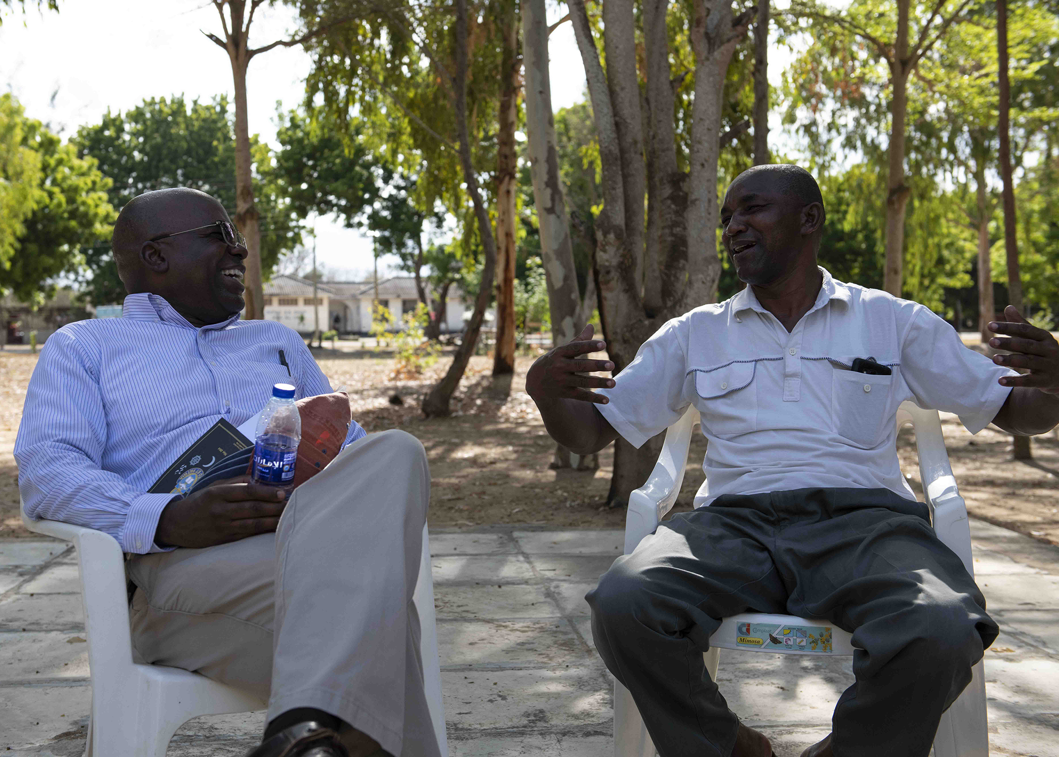 U.S. Army Col. Paul Minor, the senior chaplain assigned to the Massachusetts National Guard, talks with Kenya Navy Service Warrant Officer (Rev.) John Mutia Syanda, a senior chaplain at Kenya Navy Compound Manda Bay, while visiting Kenya April 26, 2019. The senior chaplain visited Soldiers deployed to Combined Joint Task Force-Horn of Africa and visited Kenya, which is Massachusetts’ assigned country under the State Partnership Program, April 25-28, 2019. (U.S. Air Force photo by Tech. Sgt. Shawn Nickel)