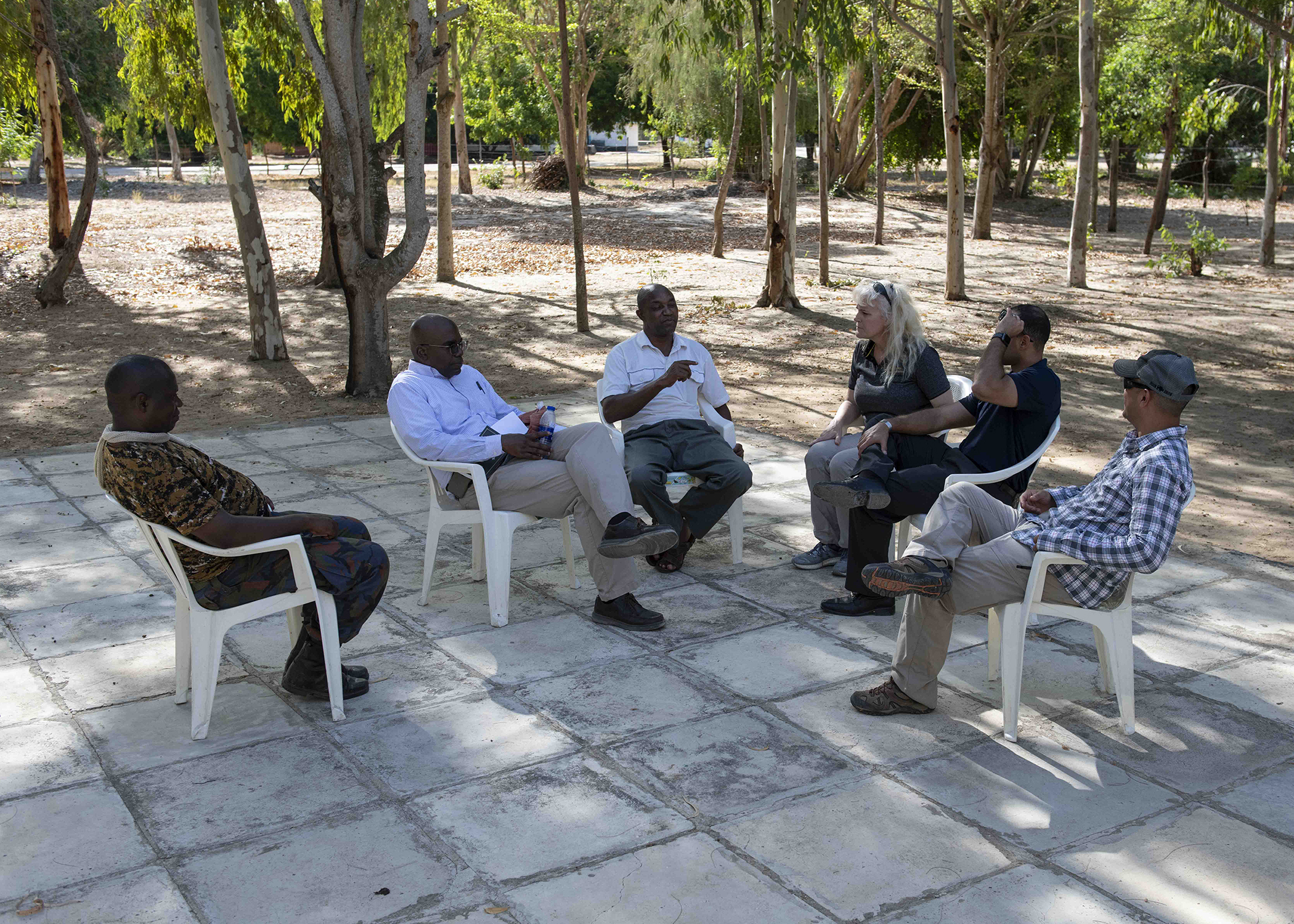 Religious Affairs staff assigned to Combined Joint Task Force-Horn of Africa, Massachusetts National Guard chaplains, and Kenya navy and army chaplains meet at Kenya Navy Compound Manda Bay, April 26, 2019. The chaplains visited Kenya as part of the State Partnership Program, which is a National Guard program that is a force multiplier aimed to build partnerships on many levels of assistance such as training, legal, logistics, religious affairs, medial and many other fields in military operations. (U.S. Air Force photo by Tech. Sgt. Shawn Nickel)