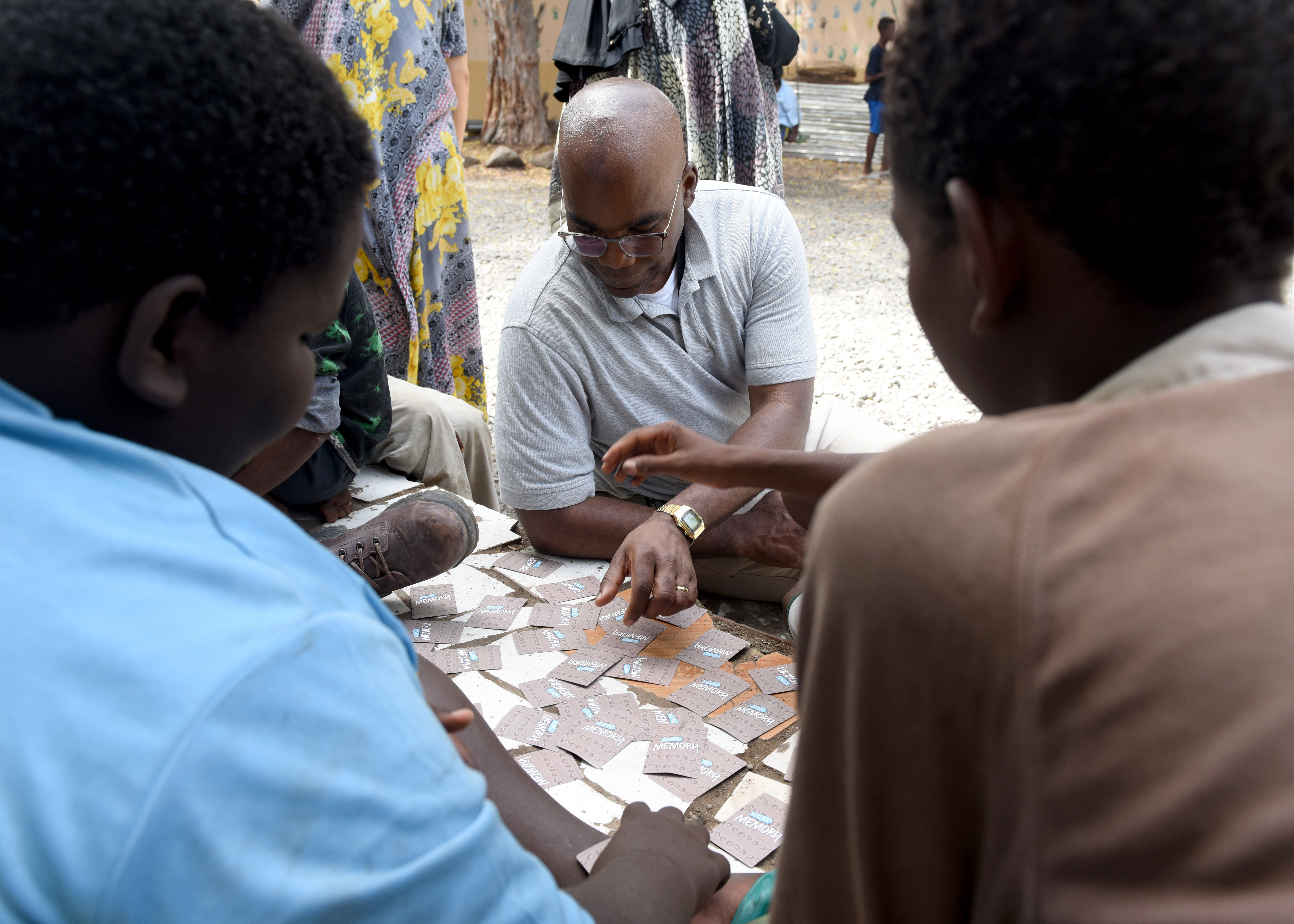 U.S. Army Col. Paul Minor, chaplain with the Massachusetts National Guard, plays a card matching game with children at Caritas in Djibouti City, Djibouti, while visiting Combined Joint Task Force-Horn of Africa (CJTF-HOA), April 25, 2019. CJTF-HOA enhances partner capabilities by providing bi-weekly assistance to Caritas, which is an international organization that was started in 1897 by the Catholic Church to provide relief to the world. (U.S. Air Force Photo by Staff Sgt. Franklin R. Ramos)