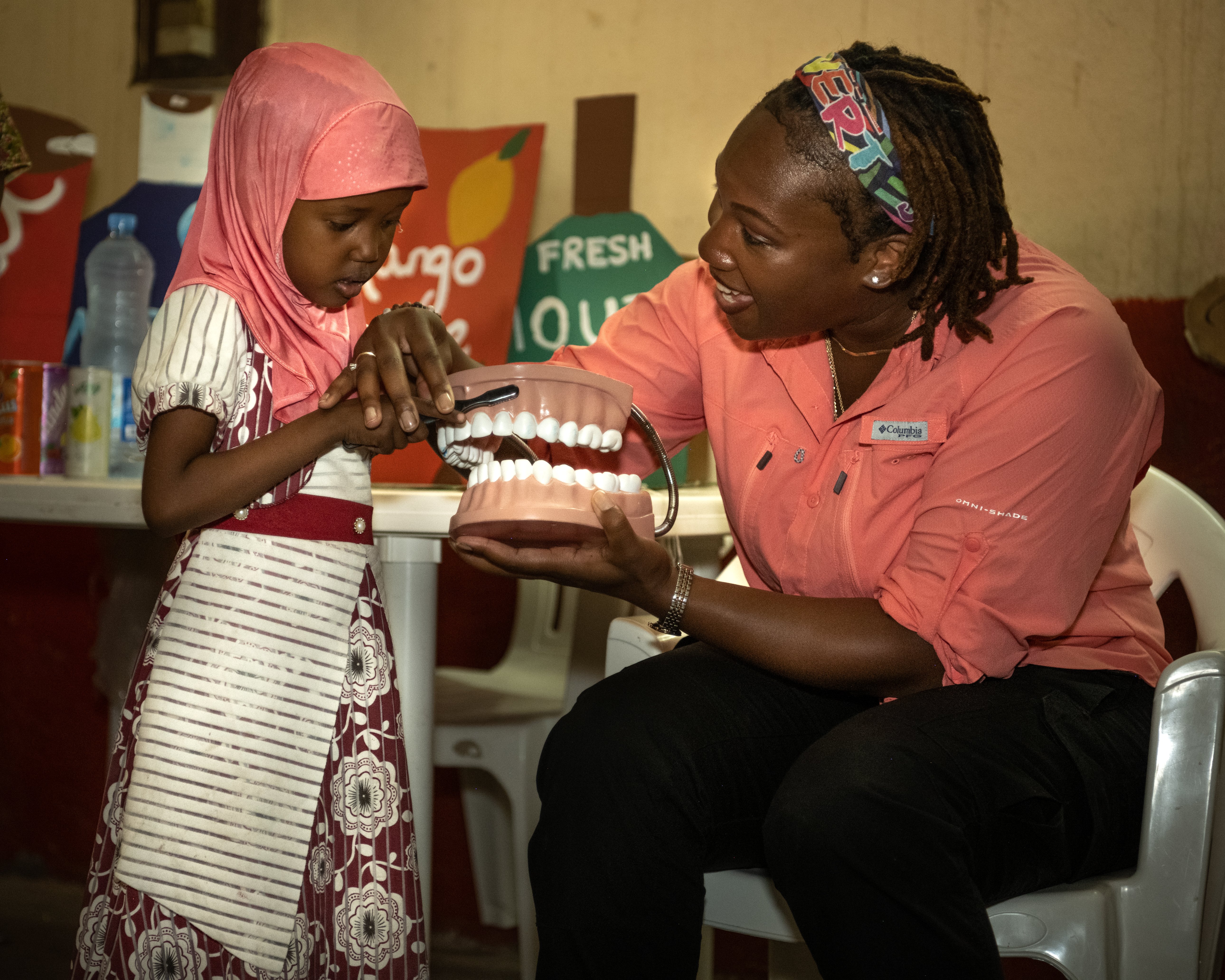 U.S. Army Sgt. Stovall Volanta, dental hygienist, Civil Affairs Functional Specialty Team, Southern European Task Force – Africa, teaches a Djiboutian girl how to brush teeth during an oral hygiene class hosted in partnership with the Association des Femmes de We’a in We’a, Djibouti, Aug. 11, 2021.