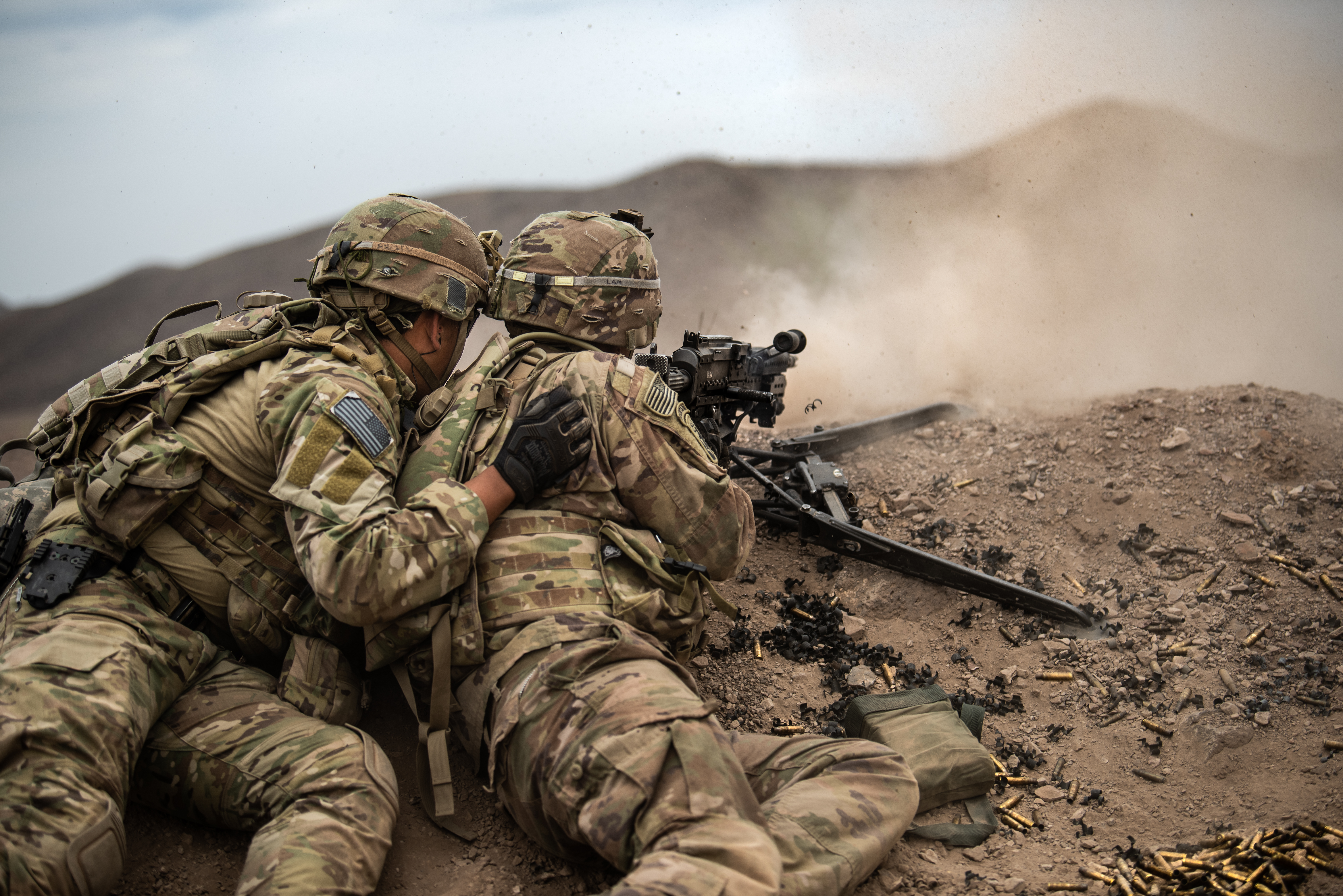 U.S. Army infantrymen with Task Force Iron Gray, Combined Joint Task Force – Horn of Africa (CJTF-HOA), provide suppressive fire during a live-fire training exercise at the Djiboutian Range Complex, Djibouti, Aug. 24, 2021. Live-fire exercises validate a platoon’s proficiency to take command and control through reinforcing concepts like supporting fire, base of fire and synchronization of fires.