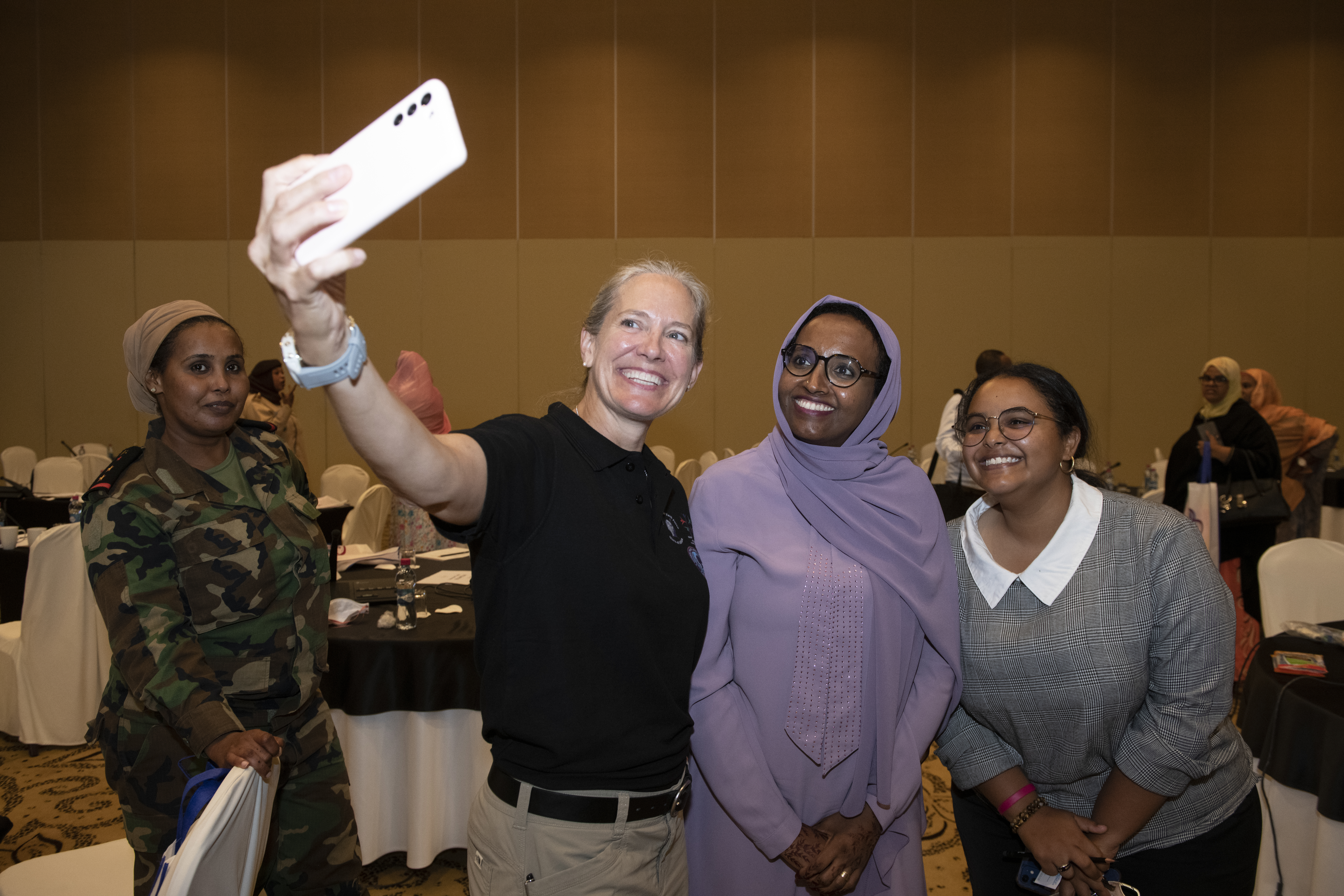 U.S. Army Maj. Gen. Jami Shawley, incoming commander of the Combined Joint Task Force – Horn of Africa (CJTF-HOA), takes a selfie with participants of a Women, Peace and Security workshop at the Palace Kempinski, Djibouti, May 8, 2022. The workshop focused on collaboration with the Ministry of Women and Family to update Djibouti's WPS National Action Plan (NAP). WPS is an integral component of U.S. Africa Command’s effort enhancing African partner capability and enabling U.S. security cooperation to better leverage contributions by both men and women. (U.S. Air Force photo by Tech. Sgt. Lynette M. Rolen)