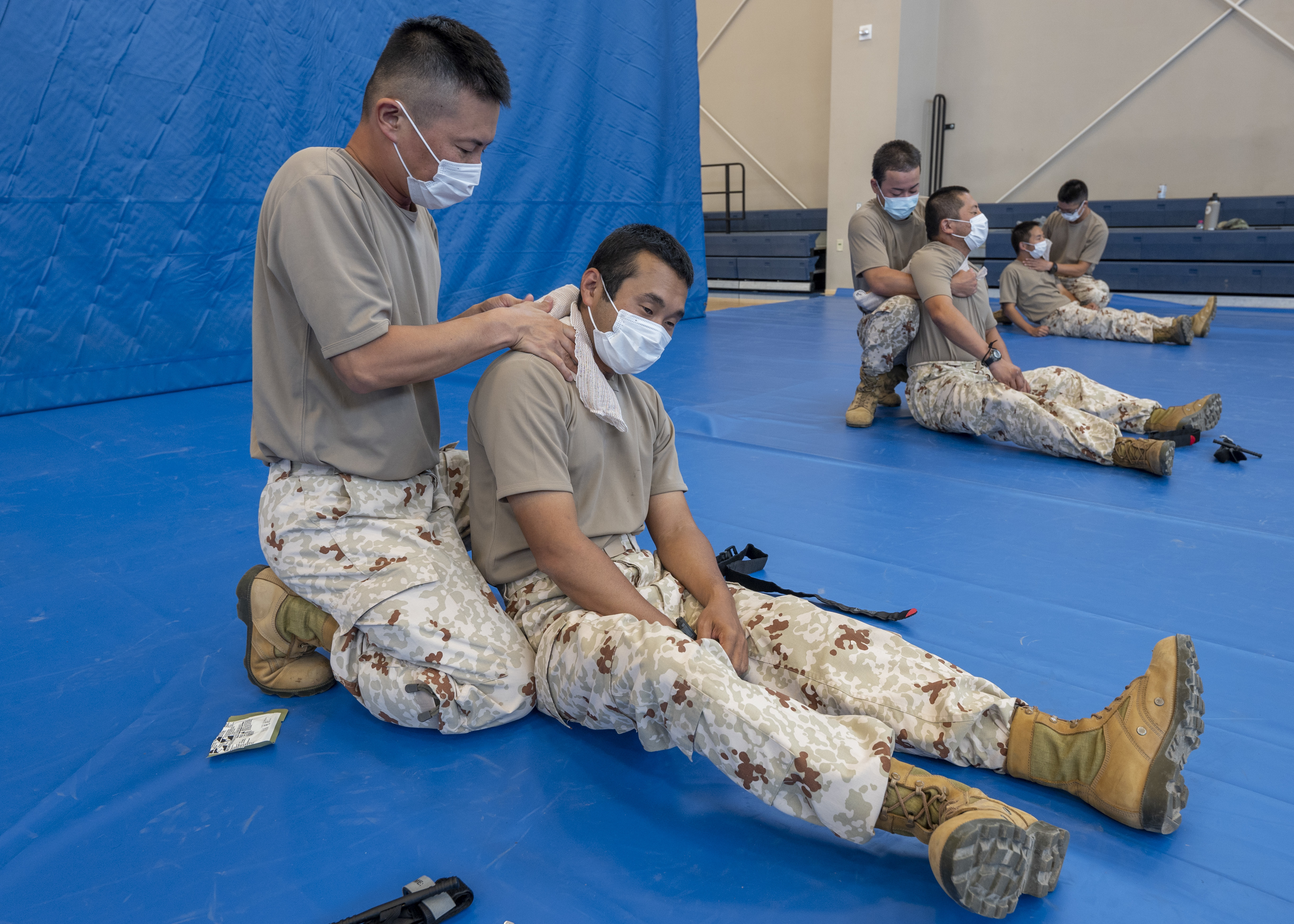 A Japan Ground Self-Defense Force (JGSDF) soldier practices Tactical Combat Casualty Care (TC3) during an information exchange with U.S. medics from Task Force Red Dragon, Combined Joint Task Force - Horn of Africa (CJTF-HOA) at Camp Lemonnier, Djibouti, May 27, 2022. The event allowed U.S. and Japanese forces to exchange information on life-saving combat care and improved overall interoperability between the forces. (U.S. Air Force photo by Senior Airman Mario Calabro).