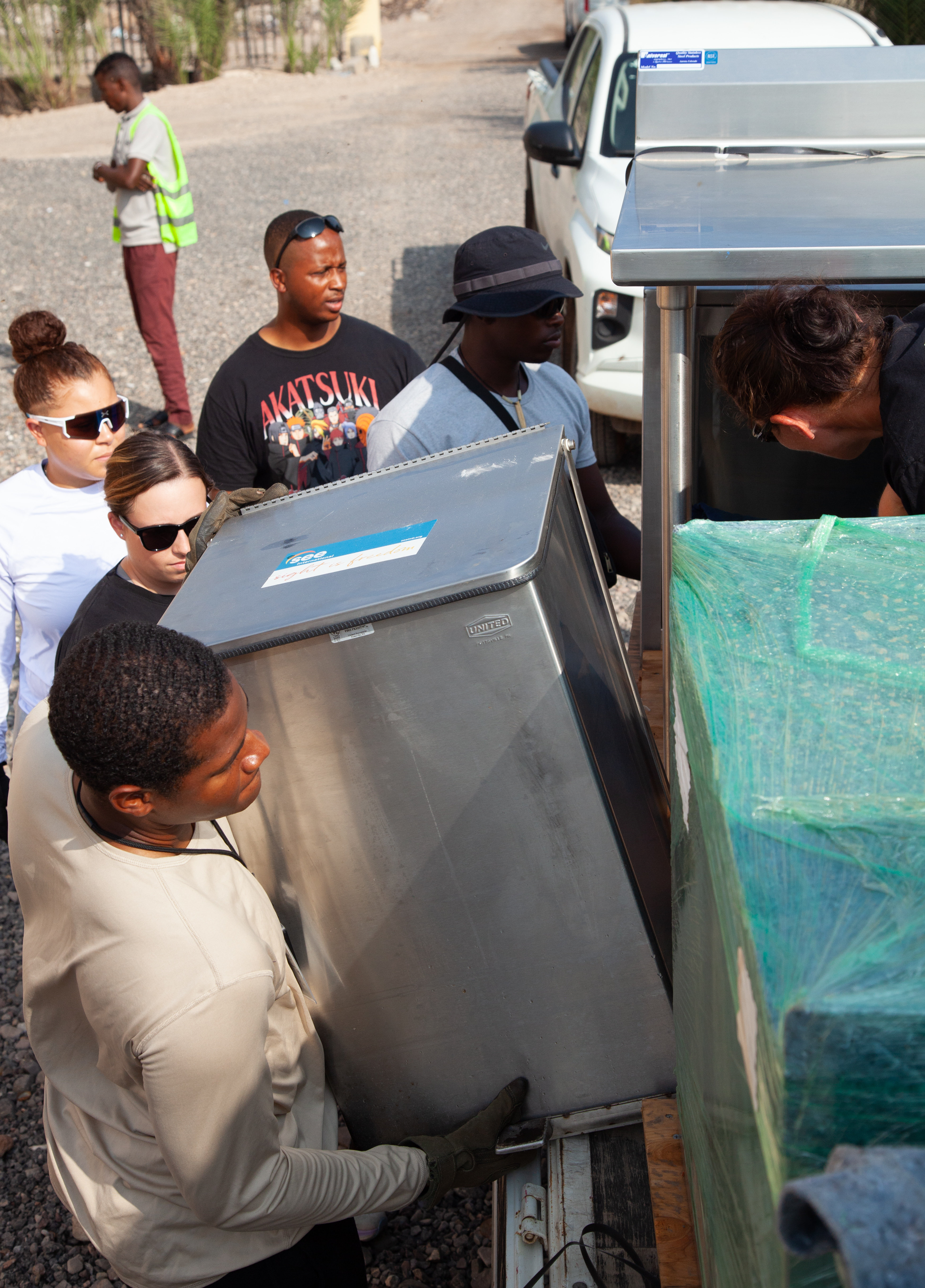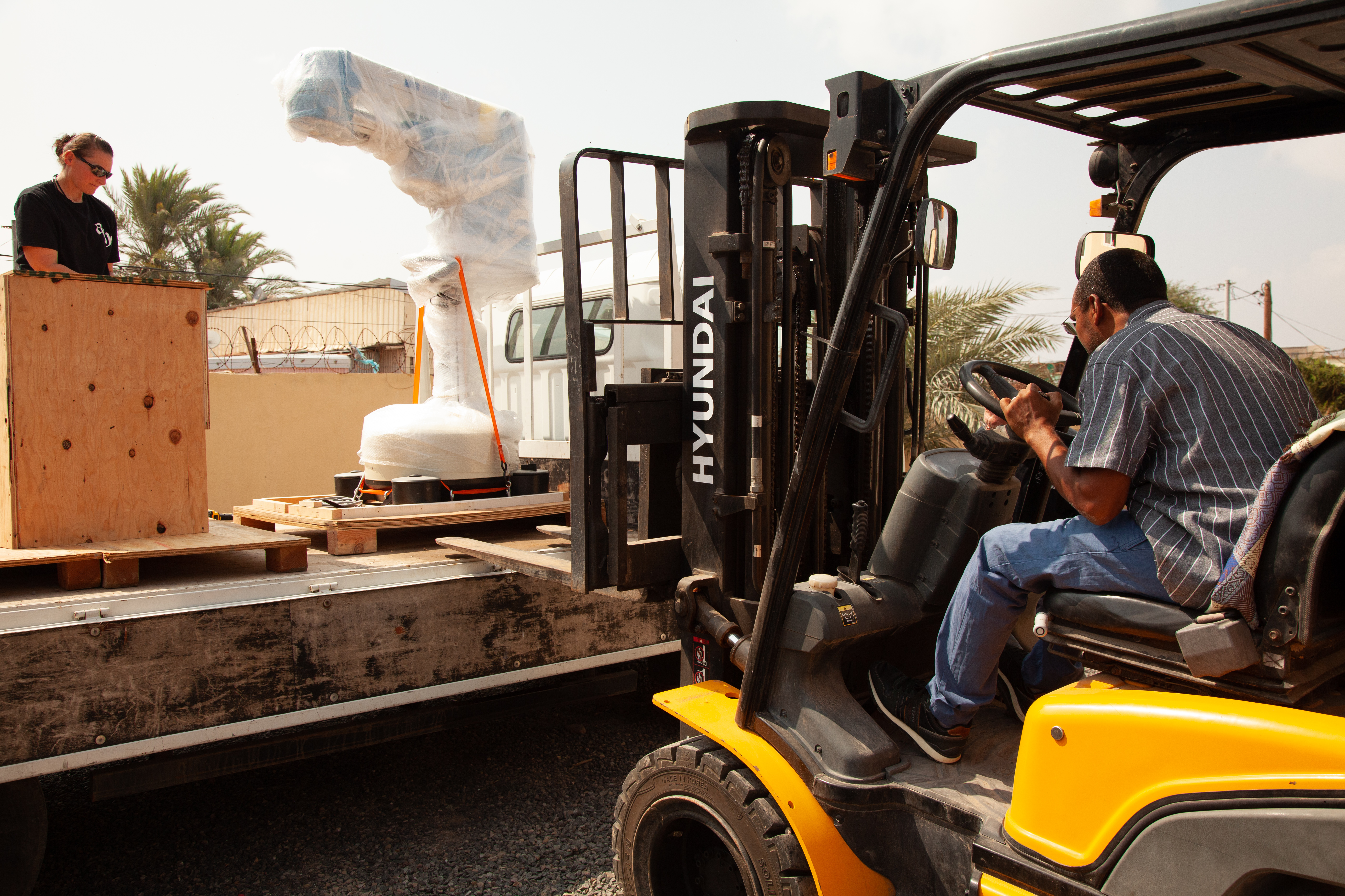 Soldiers from Impact Company, 328th Forward Support Company, 2nd Battalion, 112th Infantry Regiment belonging to Task Force Paxton, 56th Stryker Brigade Combat Team, Pennsylvania National Guard deliver medical equipment to Djibouti Adventist Health Center, April 7, 2024, Djibouti City, Djibouti.