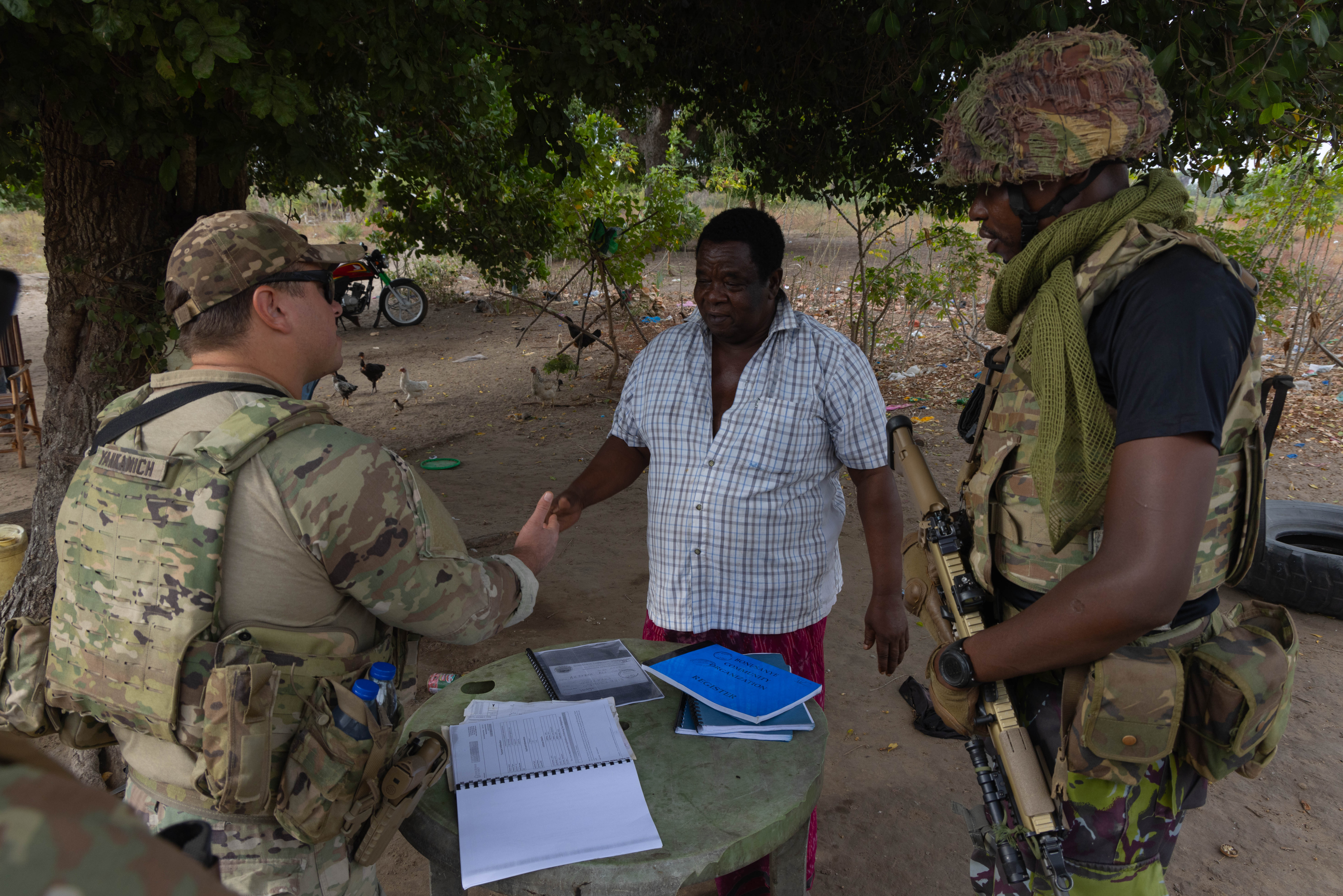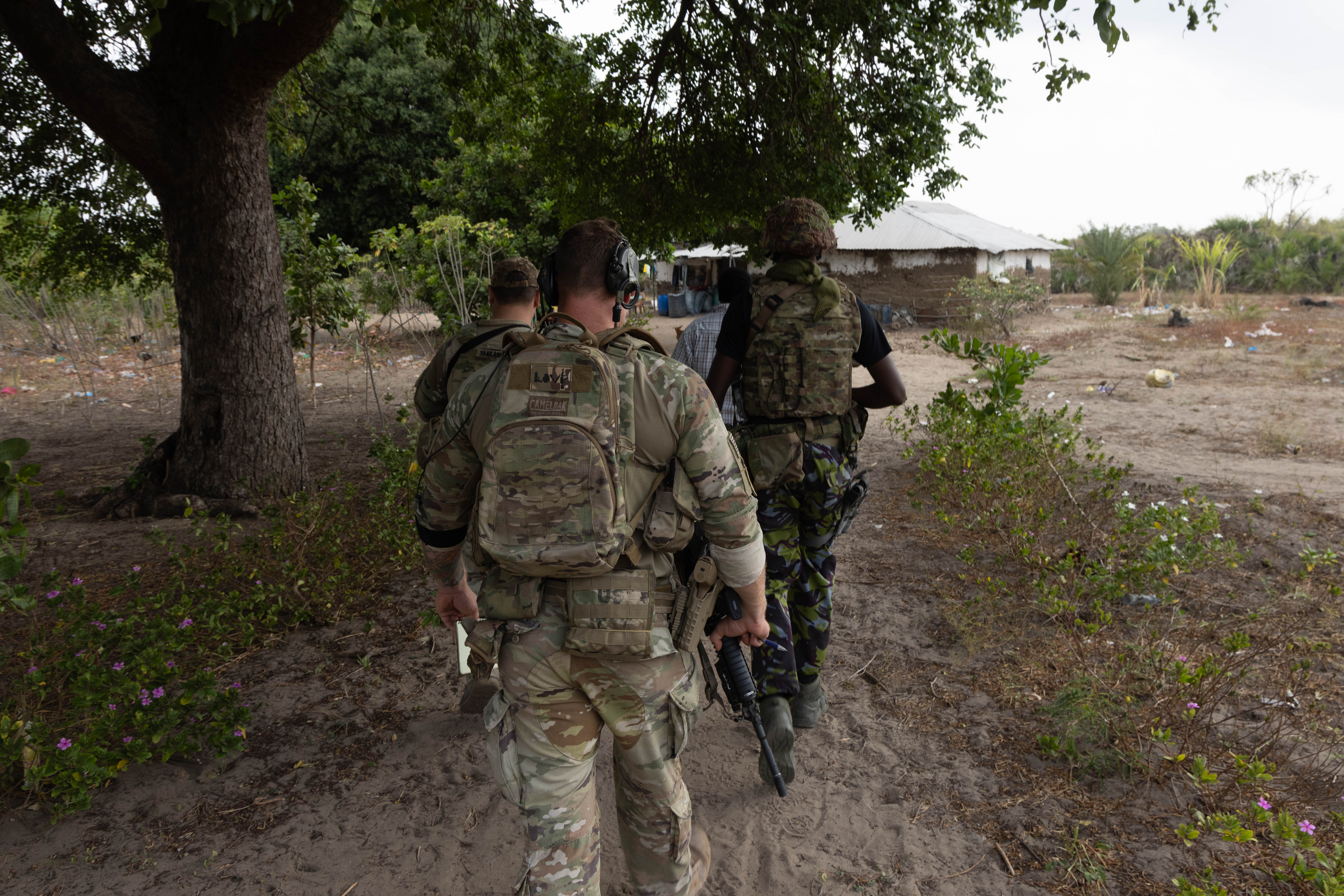 U.S. Army Soldiers assigned to Task Force Associator and Kenyan Marines conduct joint engagements with Kenyan locals during a patrol in Manda Bay, Kenya, March 2, 2025. TFAS routinely conducts knowledge exchanges and joint patrols to build capacity for partner nation independence with security. (U.S. Army photo by Cpl. Joey Ke)