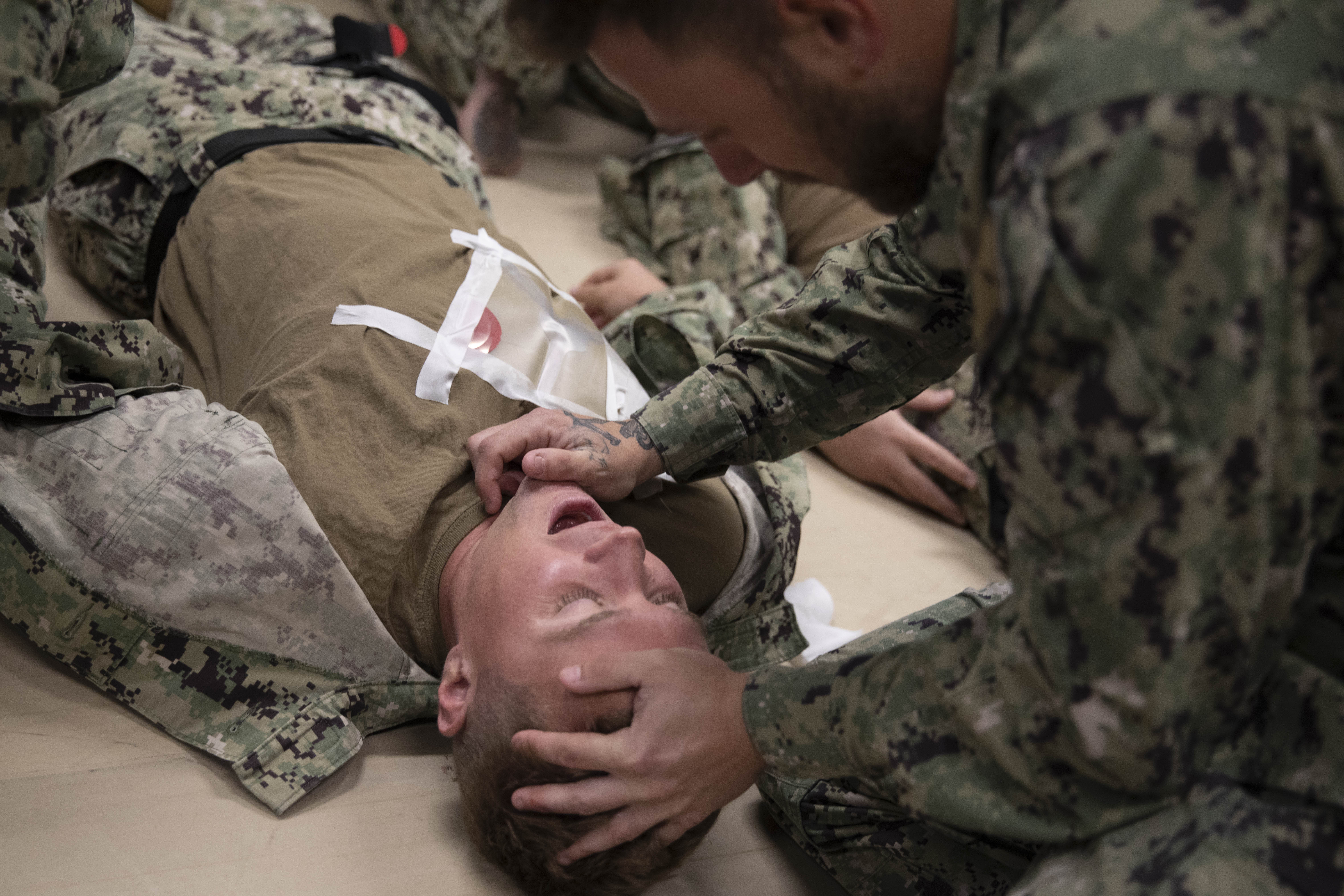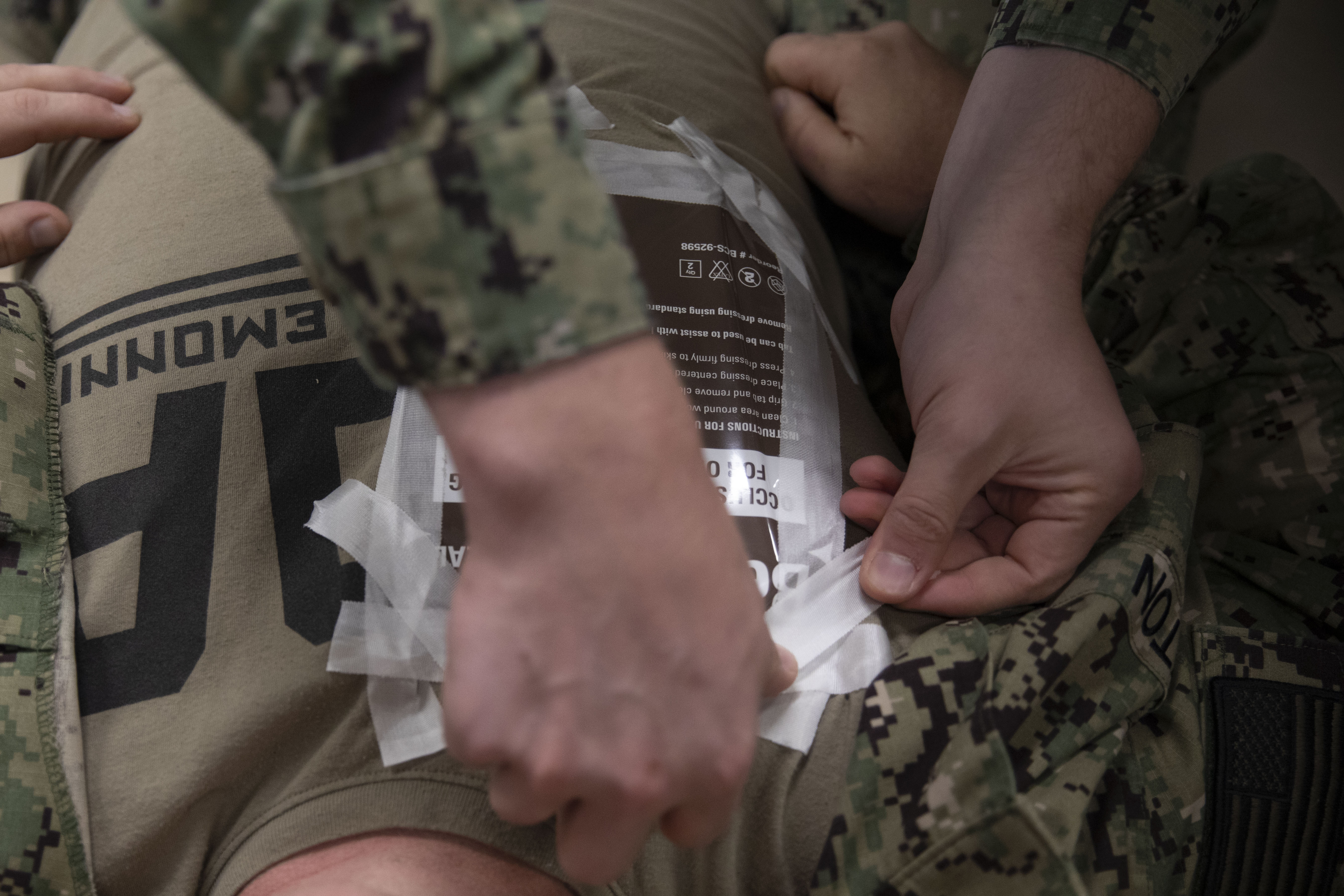 U.S. Navy Sailors practice placing a chest seal during a combat lifesavers course hosted by Combined Joint Task Force – Horn of Africa at Camp Lemonnier, Djibouti, Feb. 20, 2025. The course was designed to simulate a ship. They learned various techniques such as placing a chest decompression needle, packing a wound and wrapping it with medical bandages to control bleeding. (U.S. Army photo by Spc. Micheala Maldonado)