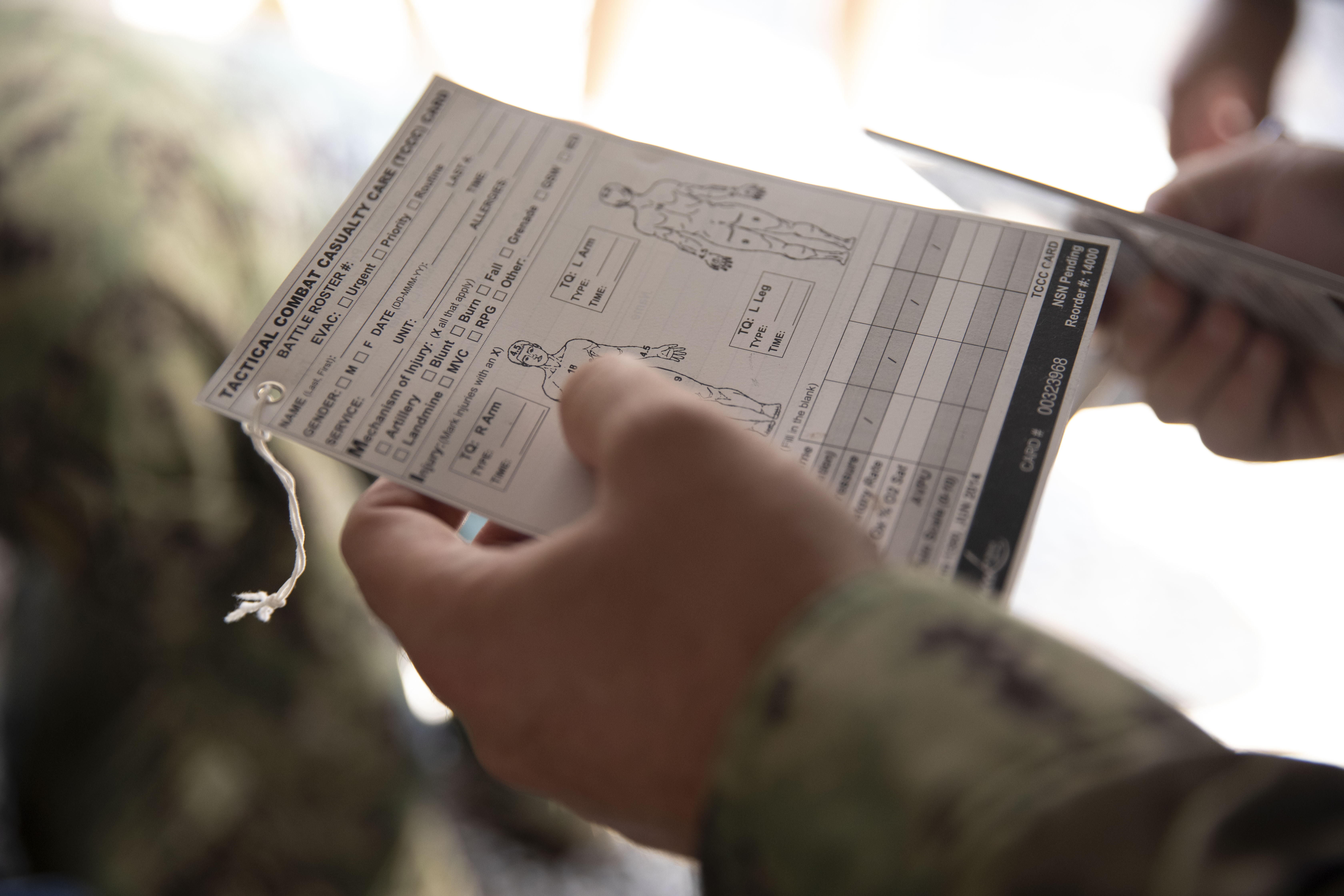 U.S. Army Sgt. Joshua Anderson, Pennsylvania National Guard assigned to Task Force Associator medical personnel, assists in a combat lifesavers course assessment hosted by Combined Joint Task Force – Horn of Africa at Camp Lemonnier, Djibouti, Feb. 21, 2025. The participants ran drills consisting of placing a nasopharyngeal airway, applying a tourniquet and assessing and caring for different wounds. (U.S. Army photo by Spc. Micheala Maldonado)