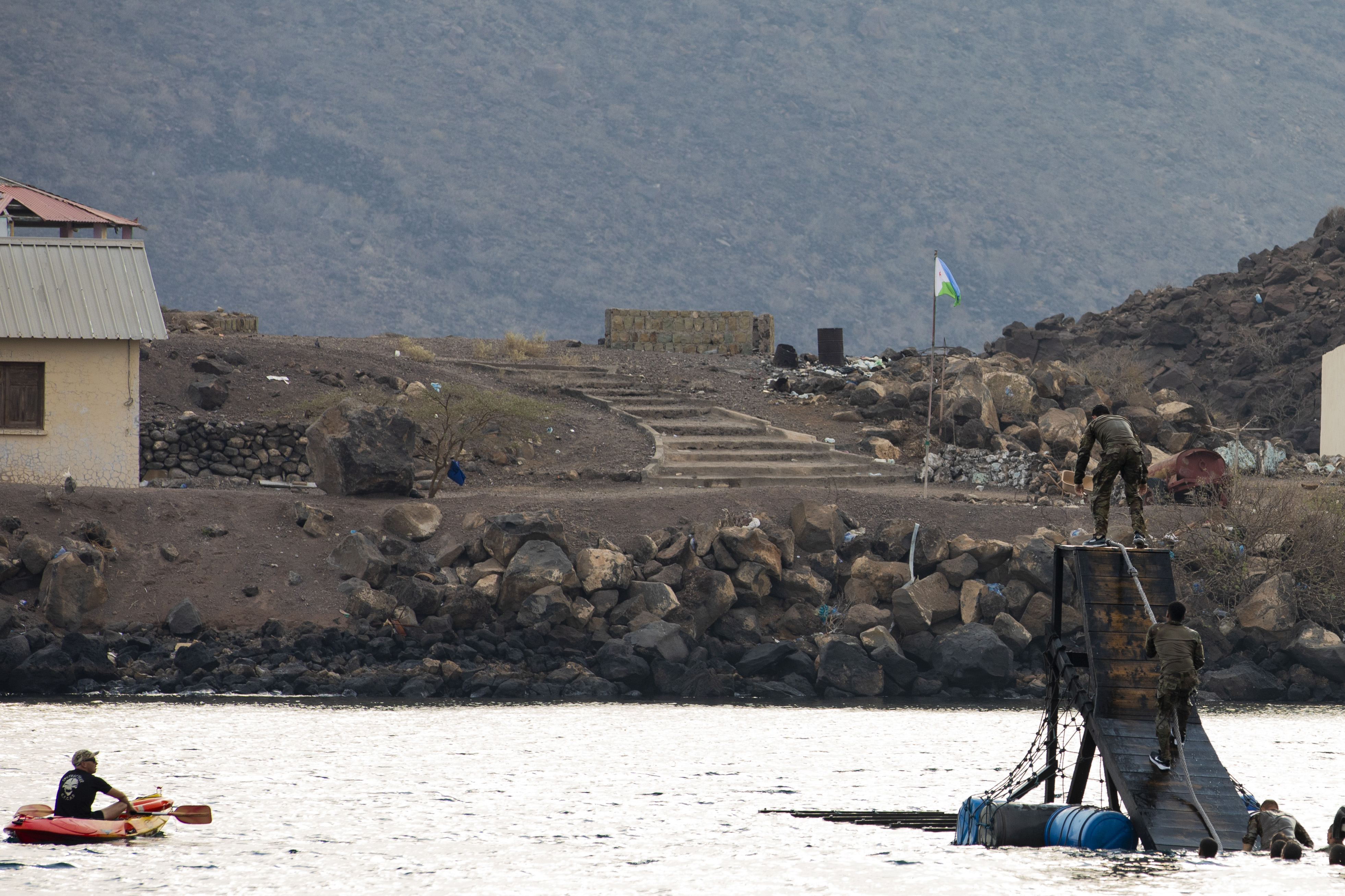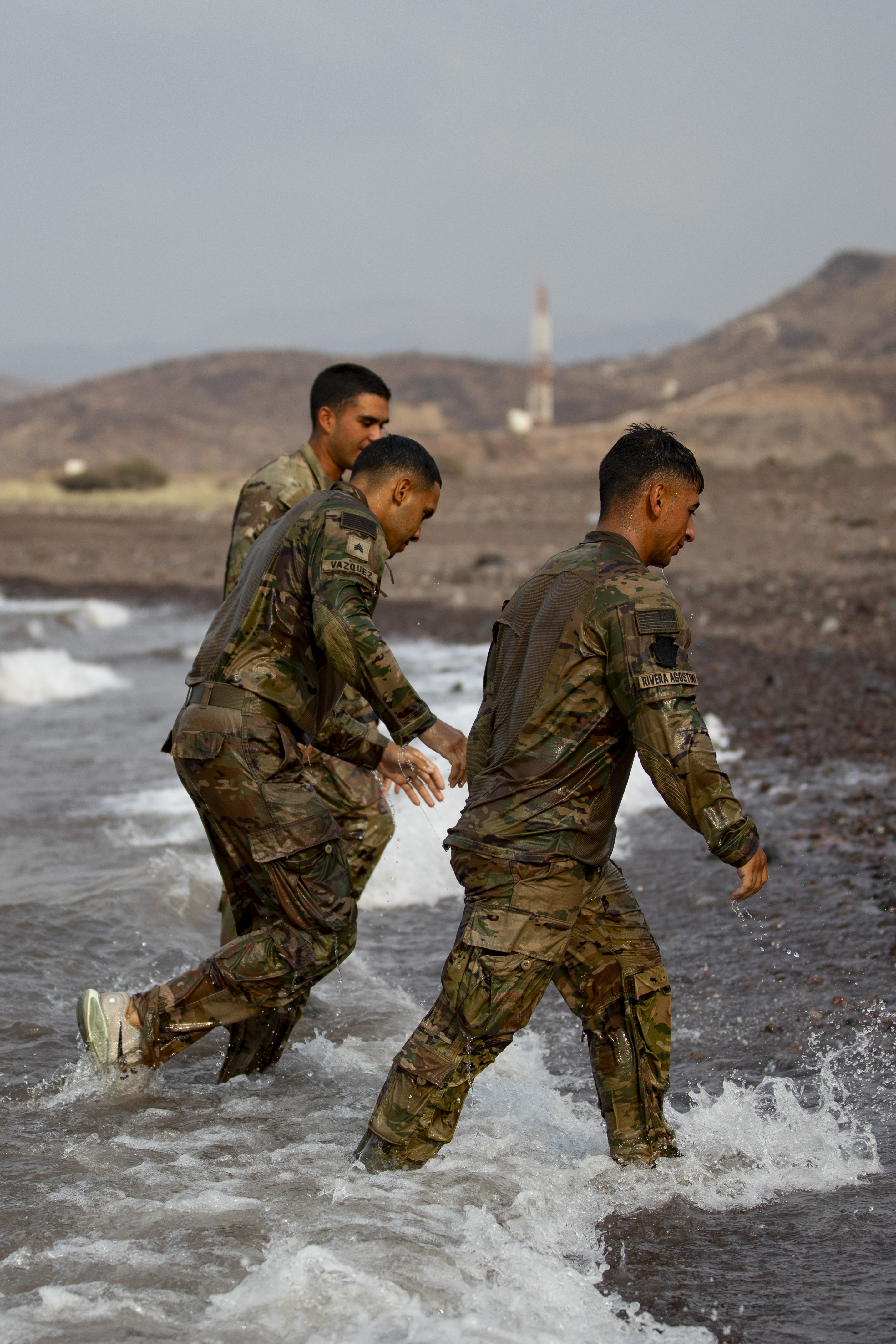 U.S. service members complete a tactical water crossing during the French Desert Commando Course at the Combat Training Center, Arta Beach, Djibouti March 19, 2025. Before crossing, the team had to send a simulated casualty across without getting the casualty wet. (U.S. Army photo by Spc. Micheala Maldonado)