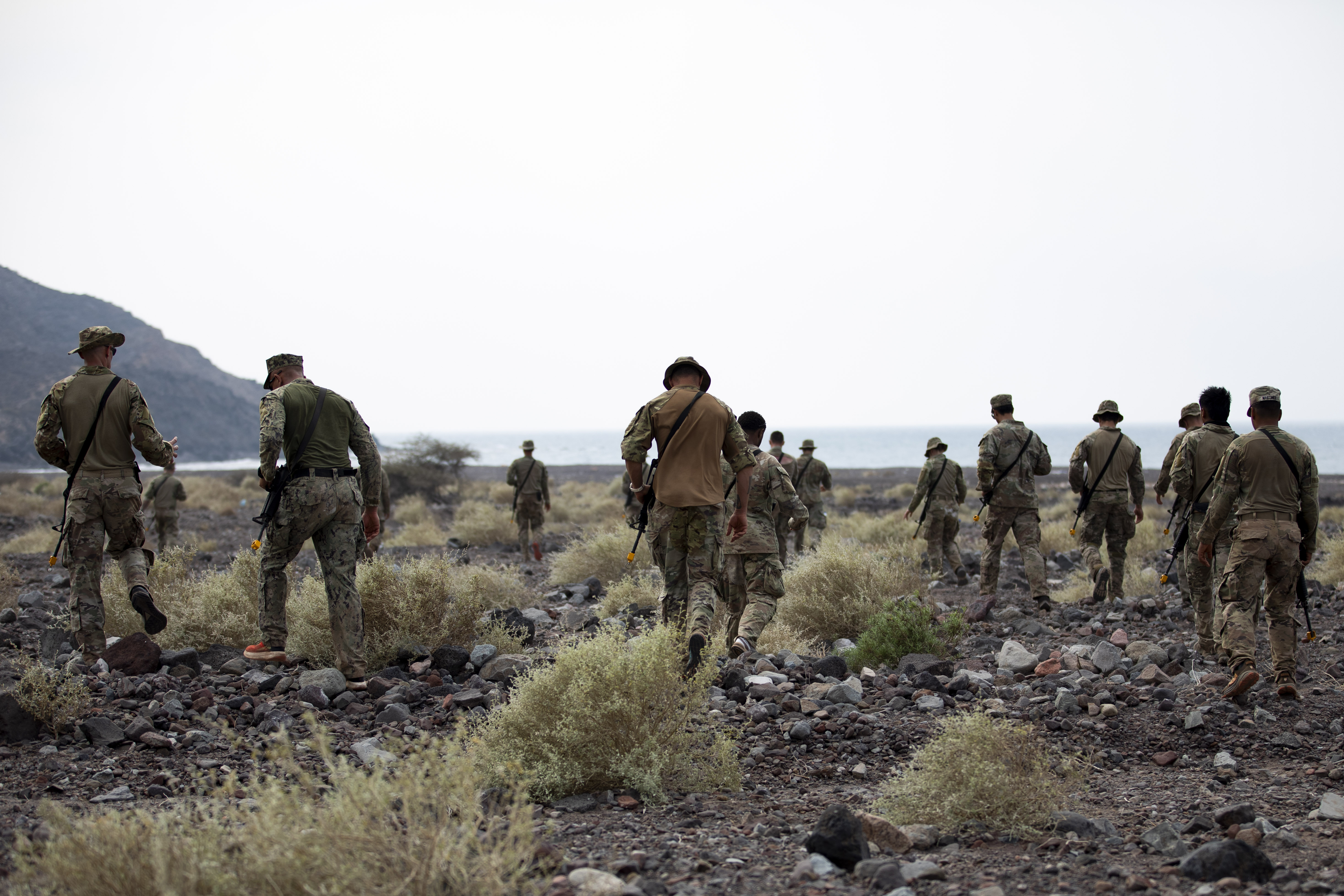 U.S. service members hike to the night survival portion of the French Desert Commando Course at the Combat Training Center, Arta Beach, Djibouti March 17, 2025. The night survival simulated a plane crash and tested how service members react and survive. (U.S. Army photo by Spc. Micheala Maldonado)