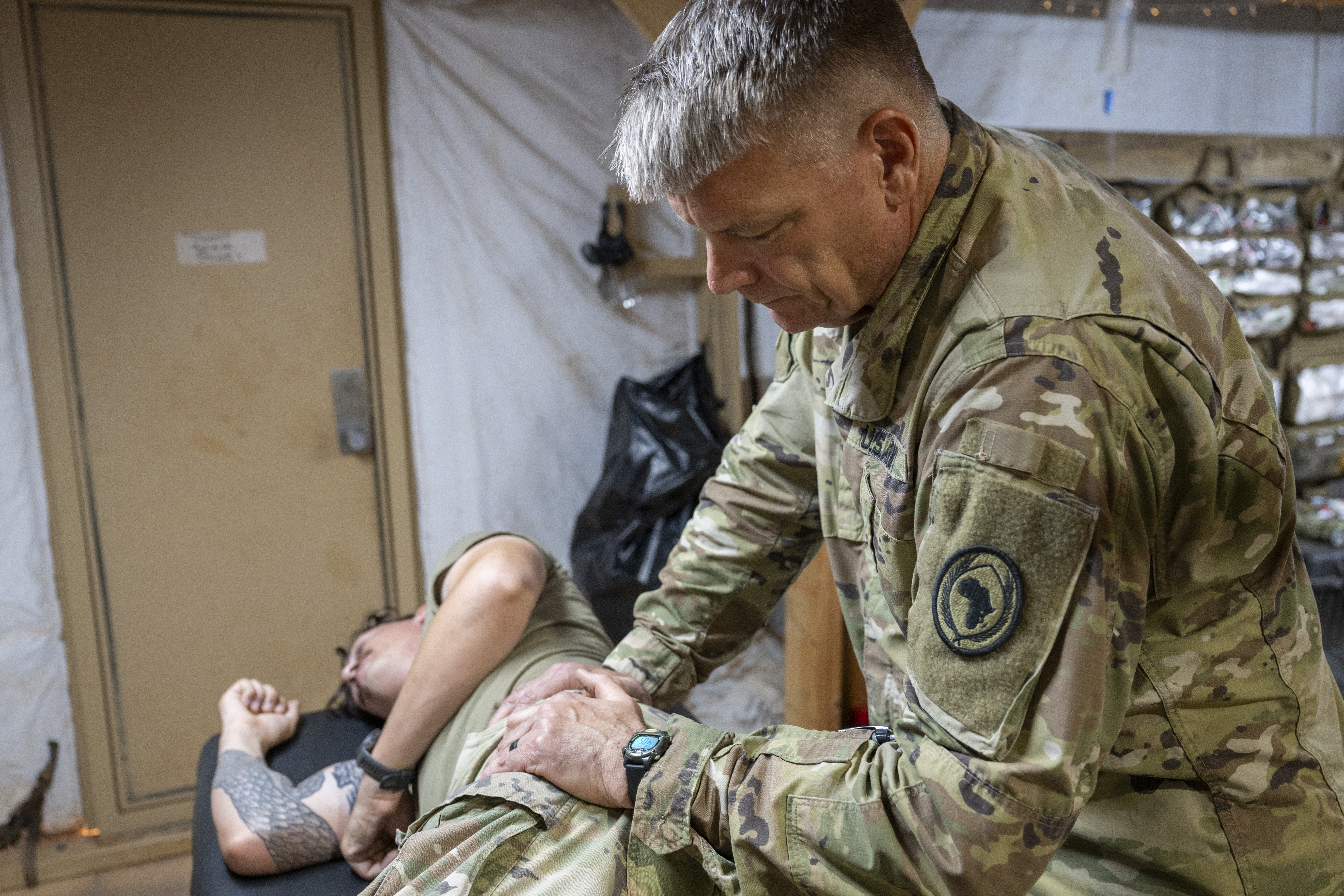 U.S. Army Lt. Col. Harry Jenkins, right, Combined Joint Task Force - Horn of Africa physical therapist, performs corrective therapy on 1st Lt. Austin Eby, Cooperative Security Location Kismayo security forces officer in charge, at CSL Kismayo, Somalia, May 20, 2025. Battlefield circulations to outstations ensure forward-deployed personnel receive essential care necessary to maintaining unit readiness. (U.S. Air Force photo by Staff Sgt. Marcus Hardy-Bannerman)