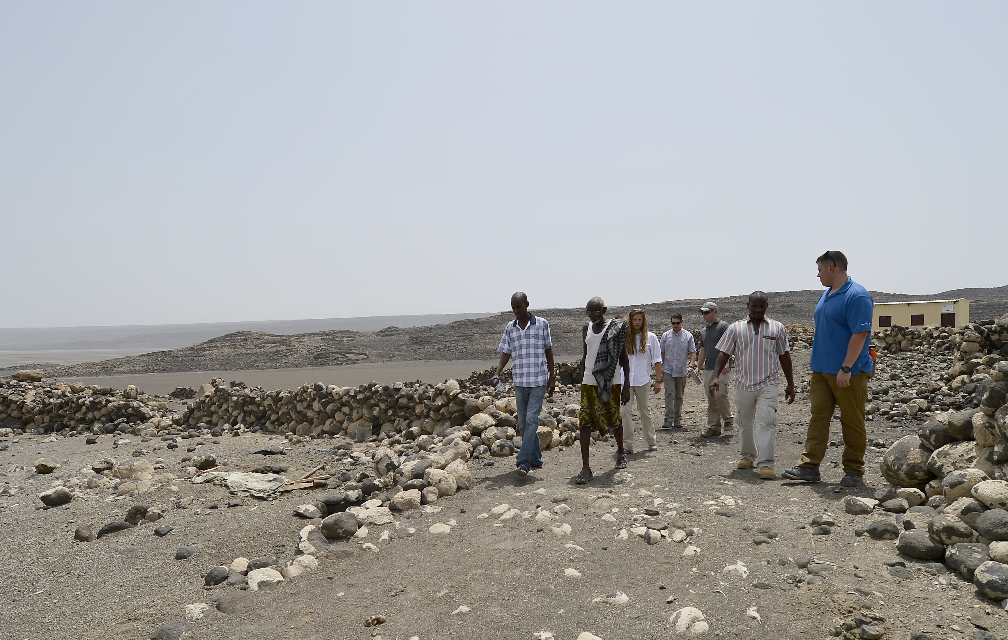 Salt Water Rest Stop village elders and members of the U.S. Army 404th Civil Affairs Battalion, assigned to Combined Joint Task Force- Horn of Africa, walk around Lake Abbé, Djibouti, May 20, 2015. Recurrent drought in the region has made life difficult for the herdsman, losing up to seventy percent of their livestock. Every few month volunteers drop off food and water to assist with malnourishment. (U.S. Air Force photo by Senior Airman Nesha Humes)