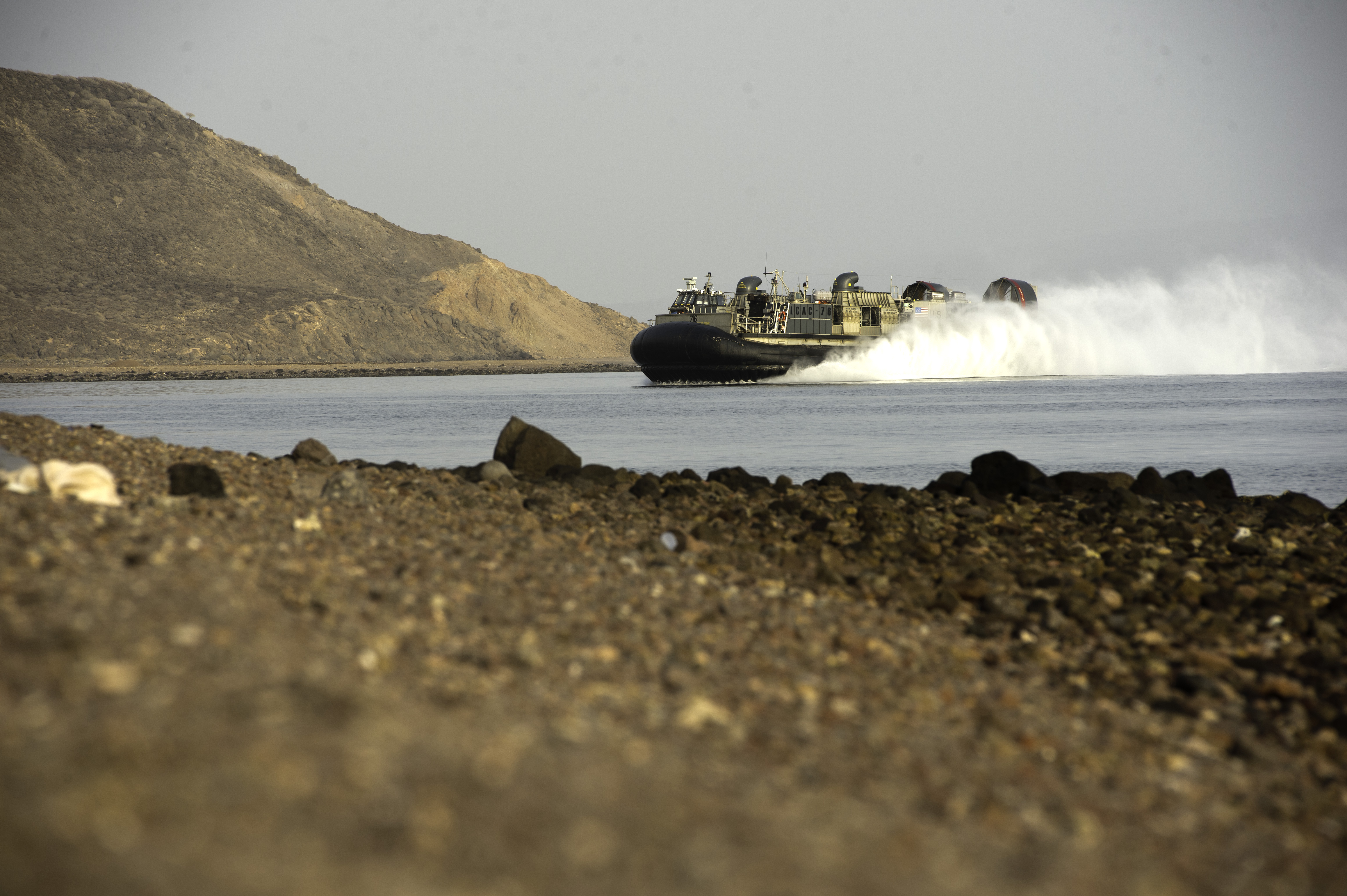 A U.S. Navy Landing Craft Air Cushion (LCAC) approaches a landing zone at Arta Beach, Djibouti, July 20, 2015. The LCAC is a hovercraft used by the U.S. Navy’s Assault Craft Units to transport and deliver personnel and equipment from ship to shore and across beaches and was in Djibouti as part of two week sustainment training exercise for the 15th Marine Expeditionary Unit. (U.S. Air Force photo by Staff Sgt. Nathan Maysonet)