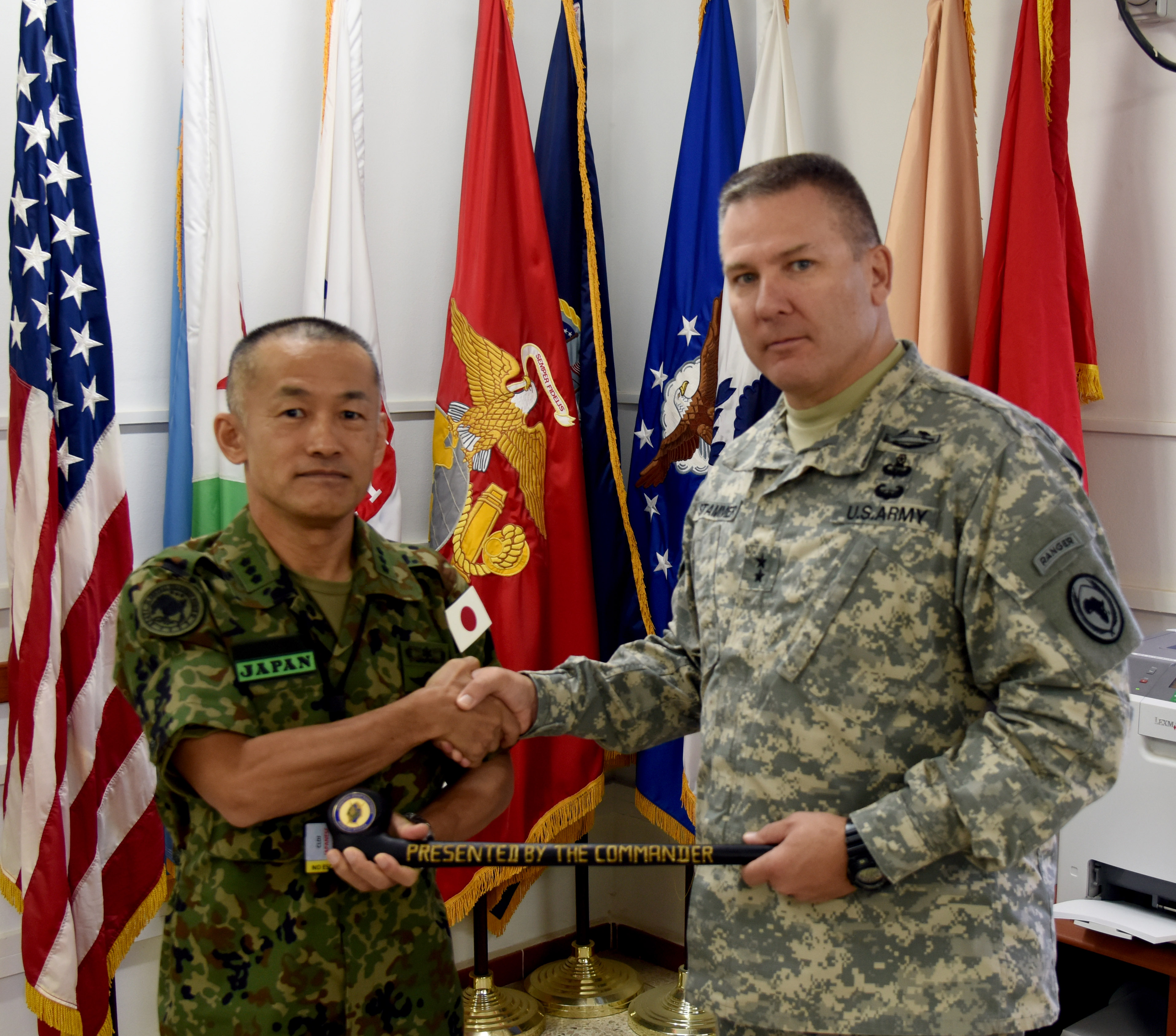 151009-N-DJ346-020 CAMP LEMONNIER, Djibouti (October 9, 2015) Major General Mark R. Stammer, Commanding General, Combined Joint Task Force – Horn of Africa, presents Lt. Gen. Hiromichi Kawamata, Commanding General, Japan Ground Self Defense Force, Central Readiness Force, with a Maasai rungu baton. The two leaders met to discuss future objectives and information sharing opportunities. General Stammer told General Kawamata that Japanese Defense Forces are and remain valued friends and partners of CJTF-HOA. (U.S. Navy photo by Chief Mass Communication Specialist Donald W. Randall/Released)