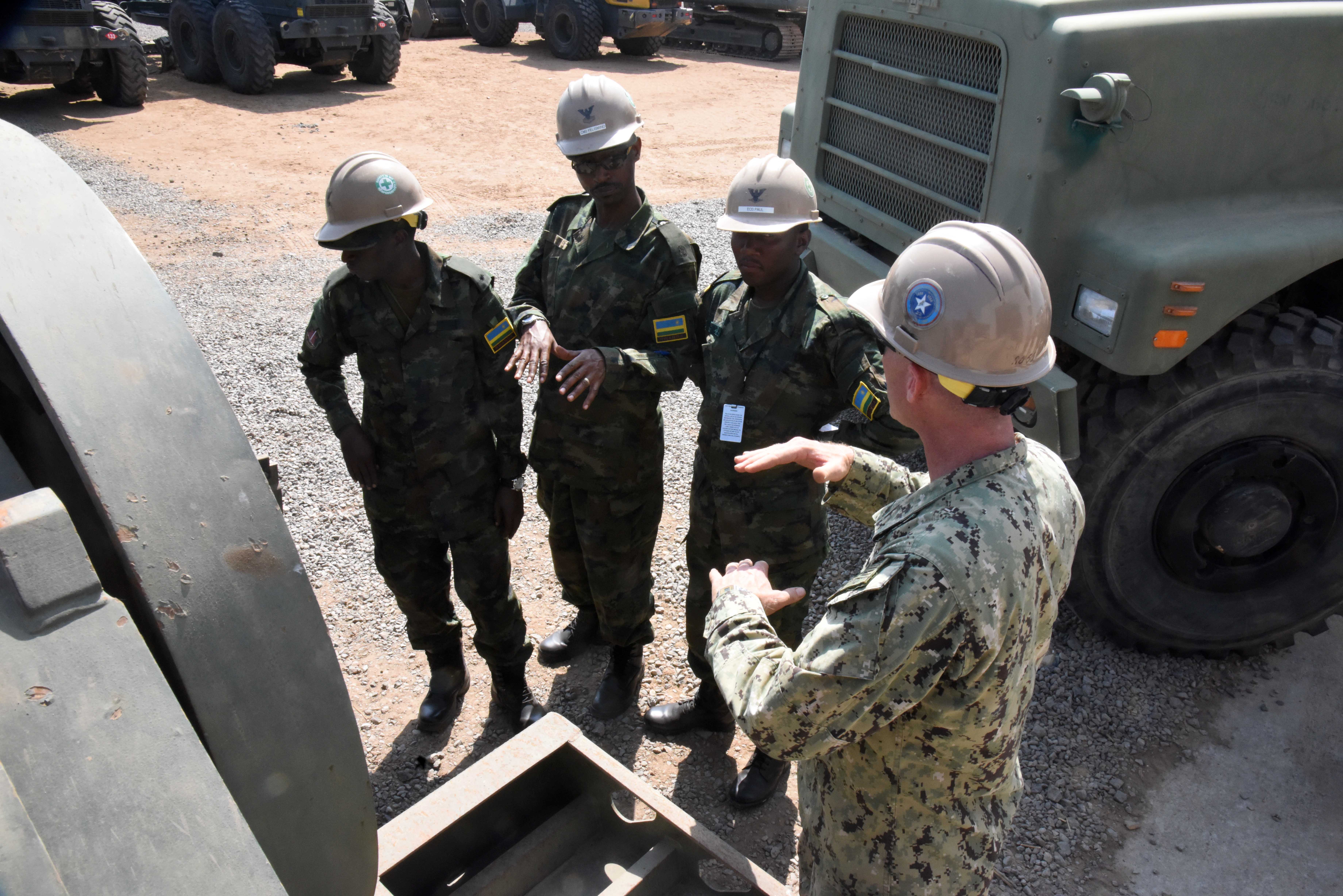 U.S. Navy Equipment Operator 2nd Class Tom Ross, Naval Mobile Construction Battalion 22, explains trailer detachment to Rwanda Defence Force engineers during their tour of Camp Lemonnier, Djibouti, Feb. 24, 2016. RDF members learned more about U.S. expeditionary camps and what equipment is used to build and maintain them. (U.S. Air Force photo by Staff Sgt. Victoria Sneed)