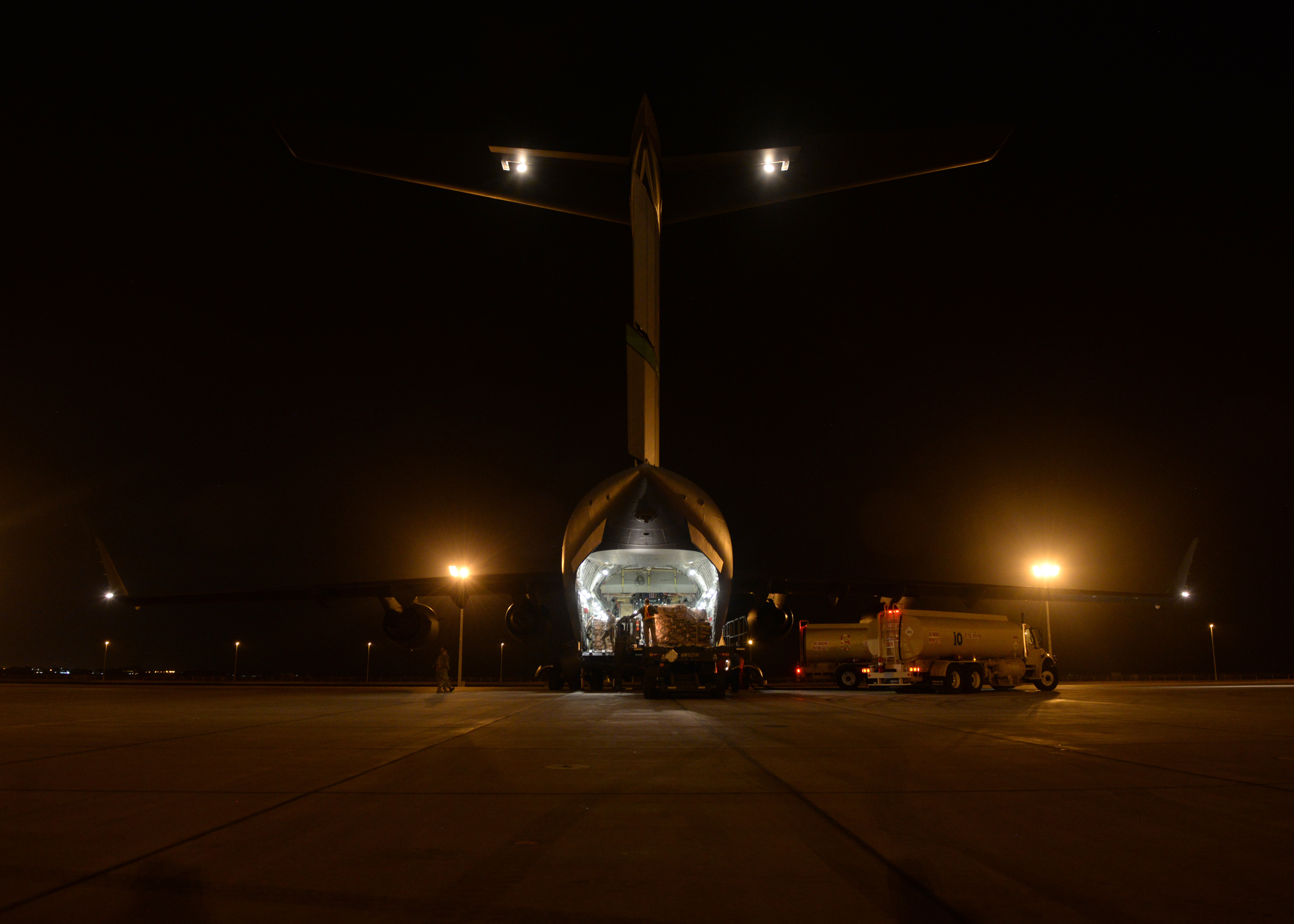 Department of Defense personnel load U.S. Agency for International Development (USAID) food pallets onto a U.S. Air Force C-17 Globemaster III, assigned to Joint Base Lewis-McChord, Washington, supporting Combined Joint Task Force-Horn of Africa (CJTF-HOA), at Camp Lemonnier, Djibouti, April 2, 2019, for the U.S. Department of Defense’s (DoD) relief effort in the Republic of Mozambique and surrounding areas following Cyclone Idai. CJTF-HOA, which is leading the DoD relief effort, transported 17,400 pounds of USAID food, a forklift, a 25K loader and palletizing equipment on the C-17 to Mozambique following a call for assistance from the USAID Disaster Assistance Response Team. (U.S. Air Force photo by Staff Sgt. Franklin R. Ramos)