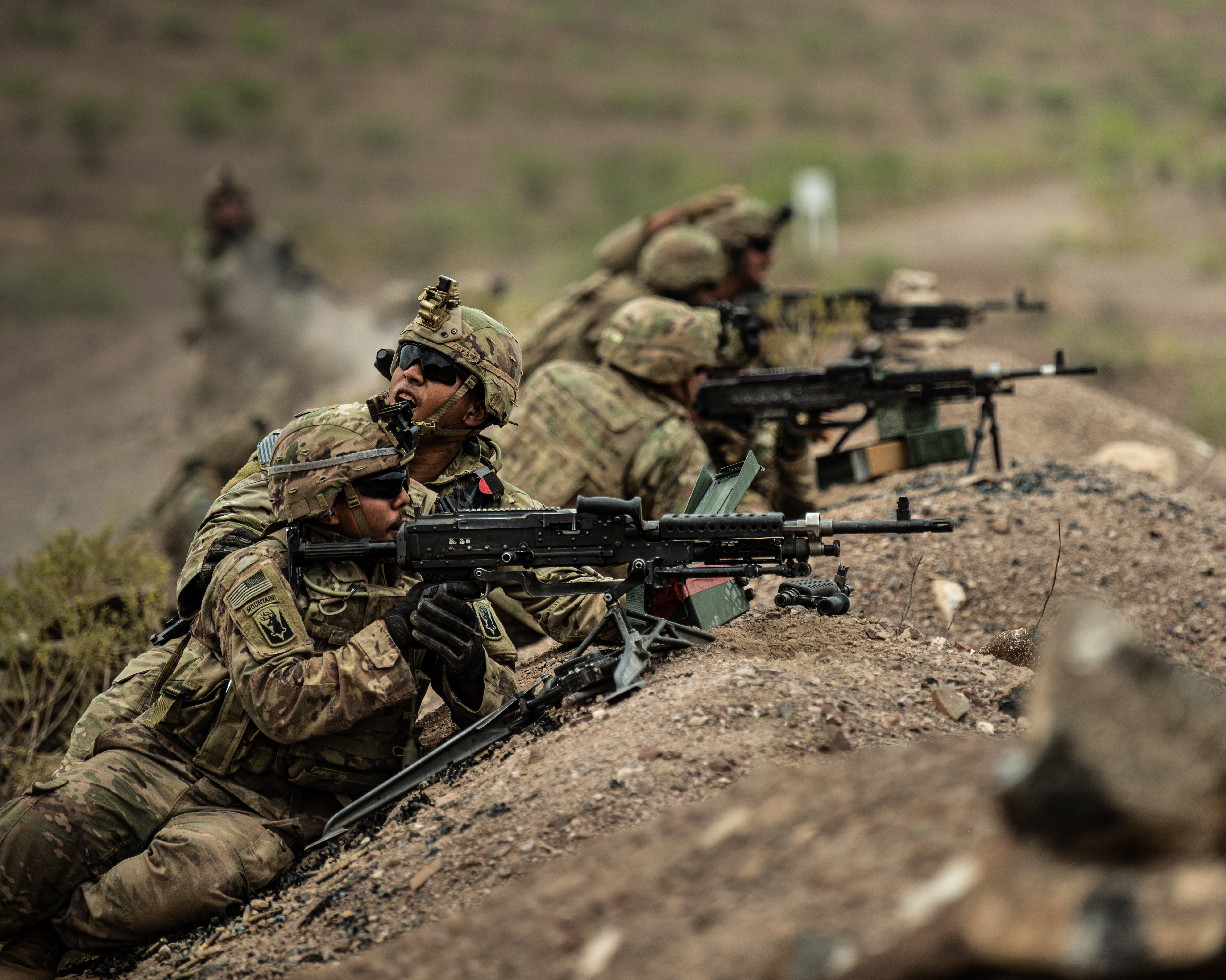 U.S. Army infantrymen with Task Force Iron Gray, Combined Joint Task Force – Horn of Africa (CJTF-HOA), take aim before providing suppressive fire during a live-fire training exercise at the Djiboutian Range Complex, Djibouti, Aug. 24, 2021. Live-fire exercises validate a platoon’s proficiency to take command and control through reinforcing concepts like supporting fire, base of fire and synchronization of fires.
