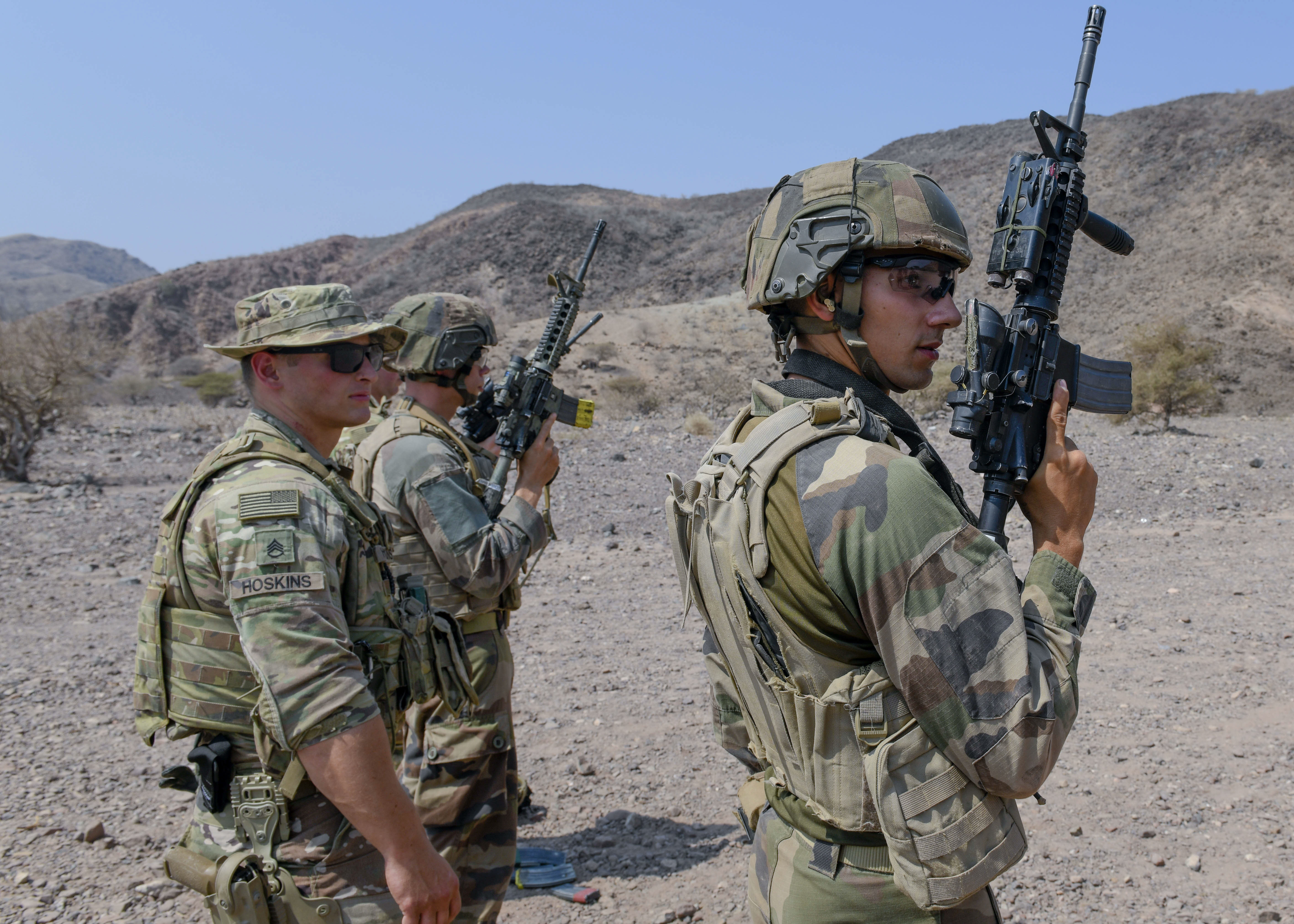 French Soldiers with French Forces in Djibouti and U.S. Soldiers with Task Force Red Dragon, Combined Joint Task Force - Horn of Africa, conduct close-quarters marksmanship training at Arta Range, Djibouti, April 13, 2022. U.S and French Forces regularly train to enhance their partnership and build proficiency. (U.S. Army photo by Spc. Kiersten Breunig)