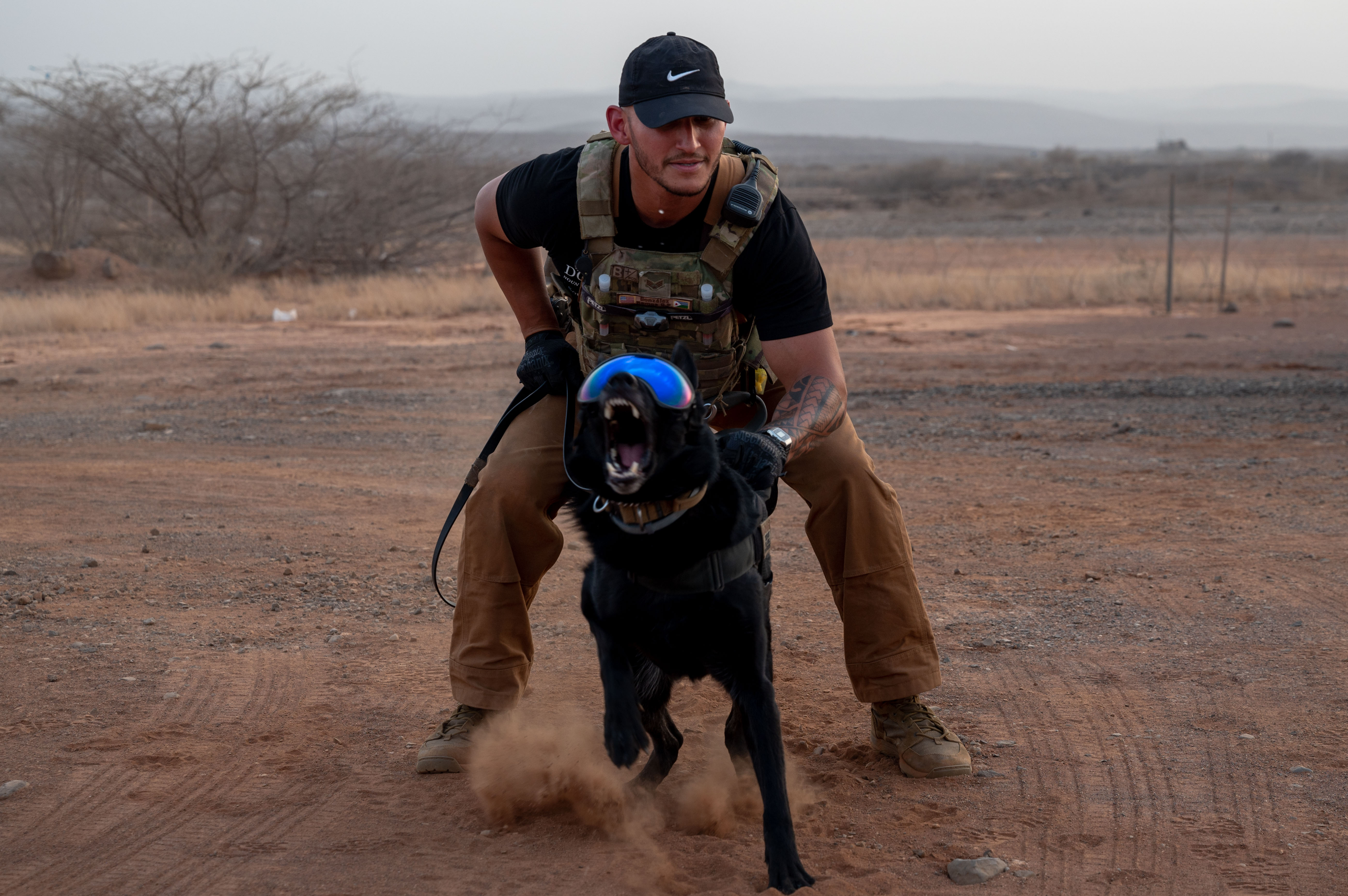 U.S. Air Force Senior Airman Gonzalez Ramos, Combined Joint Task Force-Horn of Africa K9 section military working dog handler, holds back MWD Little B at Chabelley Airfield, Djibouti, July 25, 2023. Military working dogs from the CJTF-HOA K9 and the U.S. Navy Camp Lemonnier MWD team section underwent detection-aggression-detection training, where they practice transitioning between searching for explosives or harmful substances to subduing an assailant and back to detection. (Department of Defense photo by U.S. Air Force Staff Sgt. Douglas Lorance)