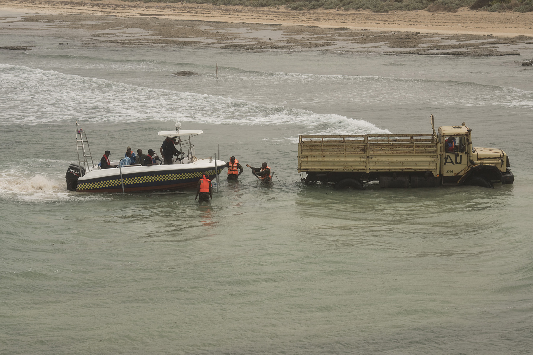 MOGADISHU, Somalia- Exercise participants from the Somali Police Force Maritime Police Unit collect a mock hostile boat and its crew during a maritime exercise demonstration of the unit’s new vessels, Aug. 25, 2016, in Mogadishu, Somalia. Representatives from approximately seven countries who assist in improving security and stability in Somalia attended the exercise demonstration and briefing from the United Nations Office on Drugs and Crime mentors on maritime and custodial work in Somalia. UNODC mentors trained the maritime unit to perform interdiction operations around the coast of Somalia with their new vessels. (U.S. Air Force photo by Staff Sgt. Tiffany DeNault)