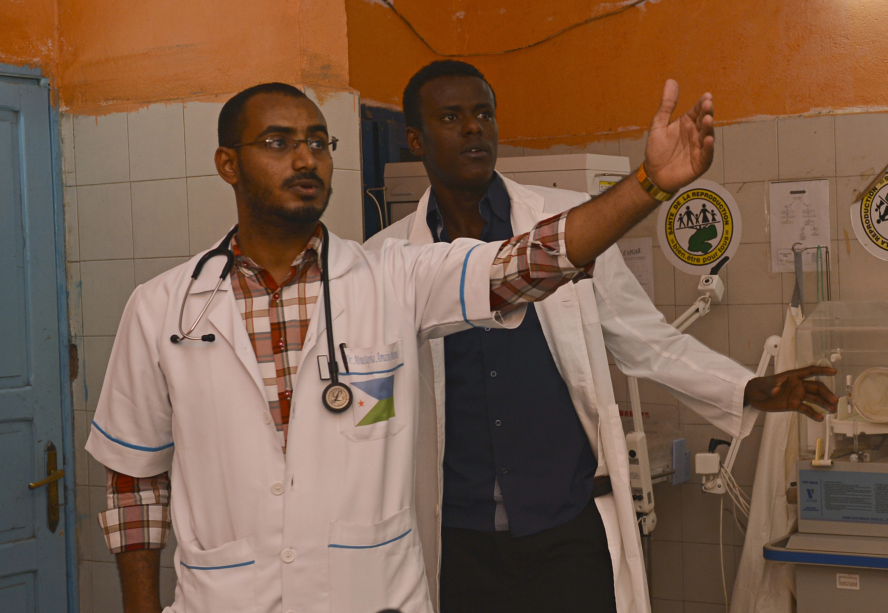 From left, Dr. Moustapha Amain Mouhammad and Dr. Abdi Alias, physicians at the Dikhil Regional Hospital talk about the facility during a tour with Combined Joint Task Force-Horn of Africa members in Dikhil, Djibouti, July 7, 2015. CJTF-HOA members visited the hospital to assess its public health, environmental and preventative medicine capacities and capabilities. (U.S. Air Force photo by Senior Airman Nesha Humes)