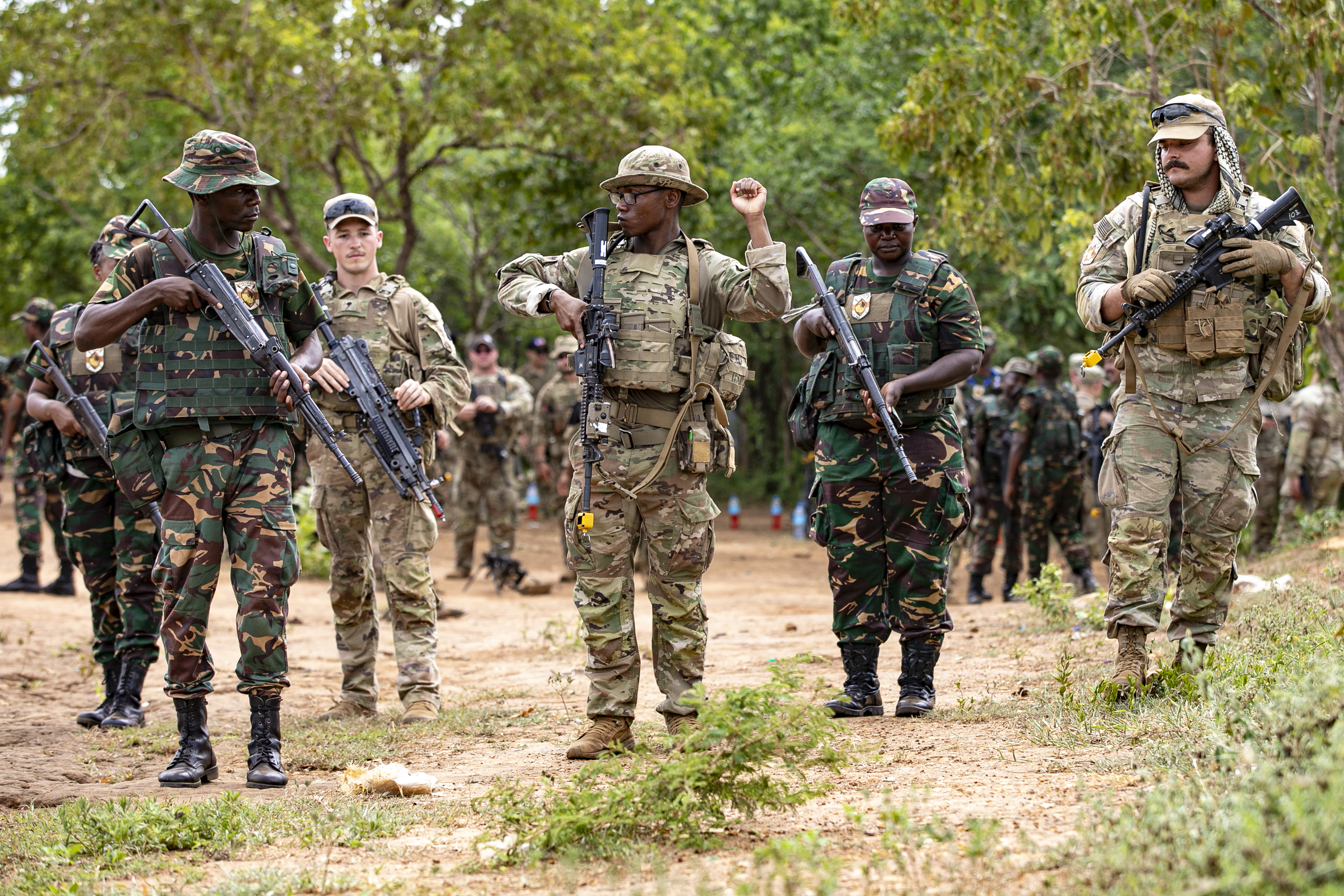 U.S. Army soldiers with the the East Africa Response Force (EARF), assigned to Combined Joint Task Force – Horn of Africa (CJTF-HOA) and Tanzania People’s Defense Force (TPDF) service members practice squad attack battle drill tactics on day two of exercise Justified Accord 2025 (JA25), at the Msata Military Training Base in Msata, Tanzania, Feb. 12, 2025. JA25 is the premier U.S. Africa Command (USAFRICOM) exercise in East Africa, designed to enhance multinational combat readiness, strengthen crisis response capabilities and empower allies and partners in the region. Led by U.S. Army Southern European Task Force, Africa (SETAF-AF) and hosted in Kenya, Djibouti and Tanzania, JA25 integrates high-intensity training scenarios that sharpen warfighting skills, increase operational reach and enhance the ability to execute complex joint and multinational operations. The exercise runs from Feb. 10–21, 2025. (U.S. Army photo by Sgt. Michael Knight)
