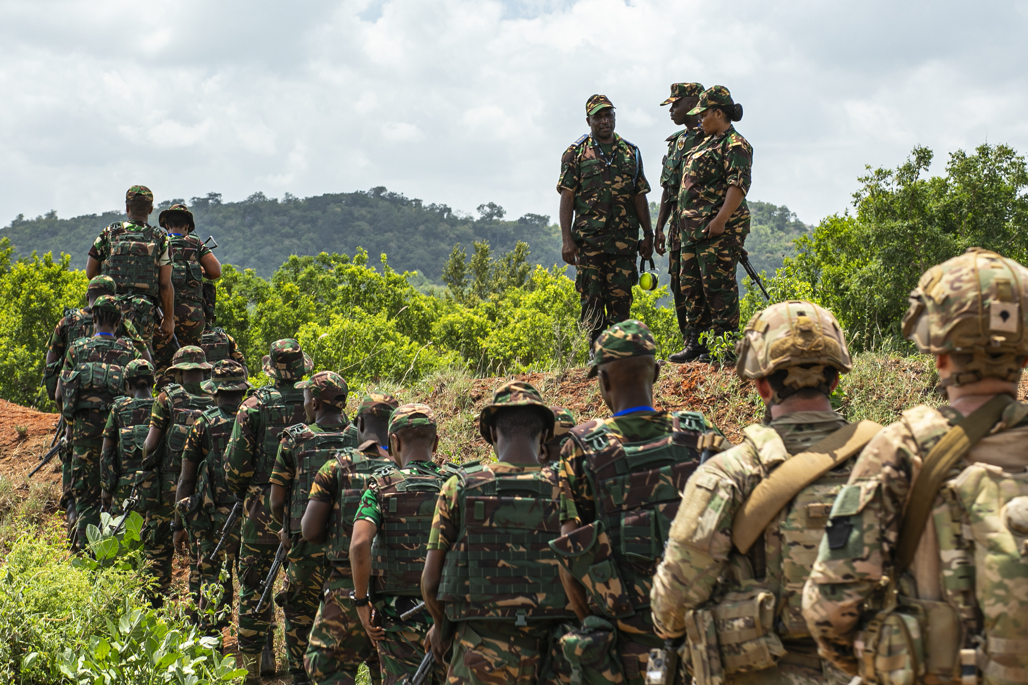 U.S. Army soldiers of the the East Africa Response Force (EARF), assigned to Combined Joint Task Force – Horn of Africa (CJTF-HOA), U.S. Army Southern European Task Force, Africa (SETAF-AF) soldiers, and the Tanzania People’s Defense Force (TPDF) discuss training objectives during day three of exercise Justified Accord 2025 (JA25) at Msata Military Training Base, Msata, Tanzania, Feb. 13, 2025. JA25 is the premier U.S. Africa Command (USAFRICOM) exercise in East Africa, designed to enhance multinational combat readiness, strengthen crisis response capabilities and empower allies and partners in the region. Led by U.S. Army Southern European Task Force, Africa (SETAF-AF) and hosted in Kenya, Djibouti and Tanzania, JA25 integrates high-intensity training scenarios that sharpen warfighting skills, increase operational reach and enhance the ability to execute complex joint and multinational operations. The exercise runs from Feb. 10–21, 2025. (U.S. Army photo by Sgt. Michael Knight)