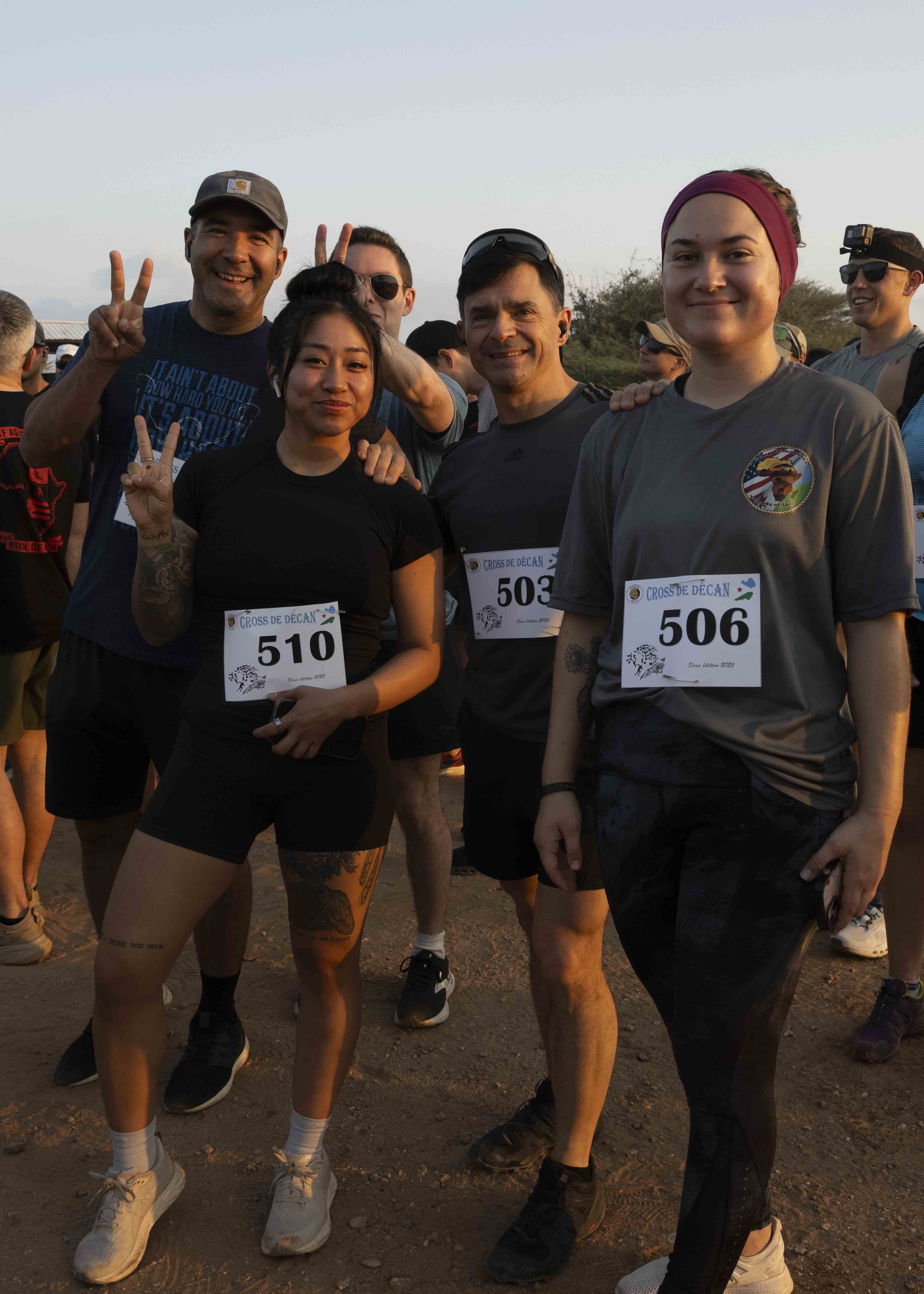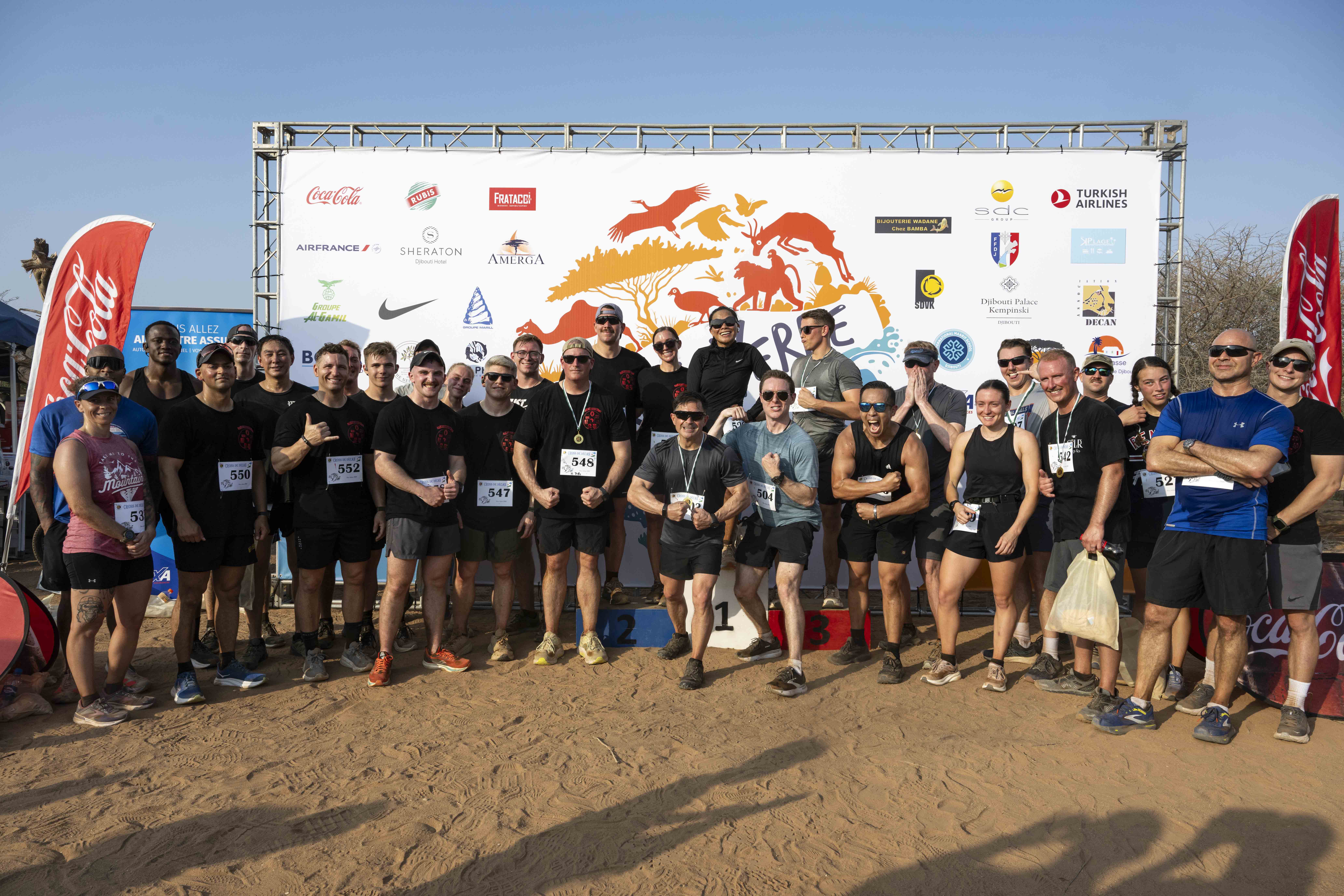 Participants from Combined Joint Task Force - Horn of Africa pose for a photo after running the Cross du Refuge Décan 10k at the Decan Wildlife Refuge, Djibouti, Jan. 31, 2025. Decan, a french acronym DÉCouvrir et Aider la Nature ‘discover and help nature’ was started in 2001 by a veterinarian to help animals with rehabilitation. (U.S. Air Force photo by Airman 1st Class Joseph Bartoszek)