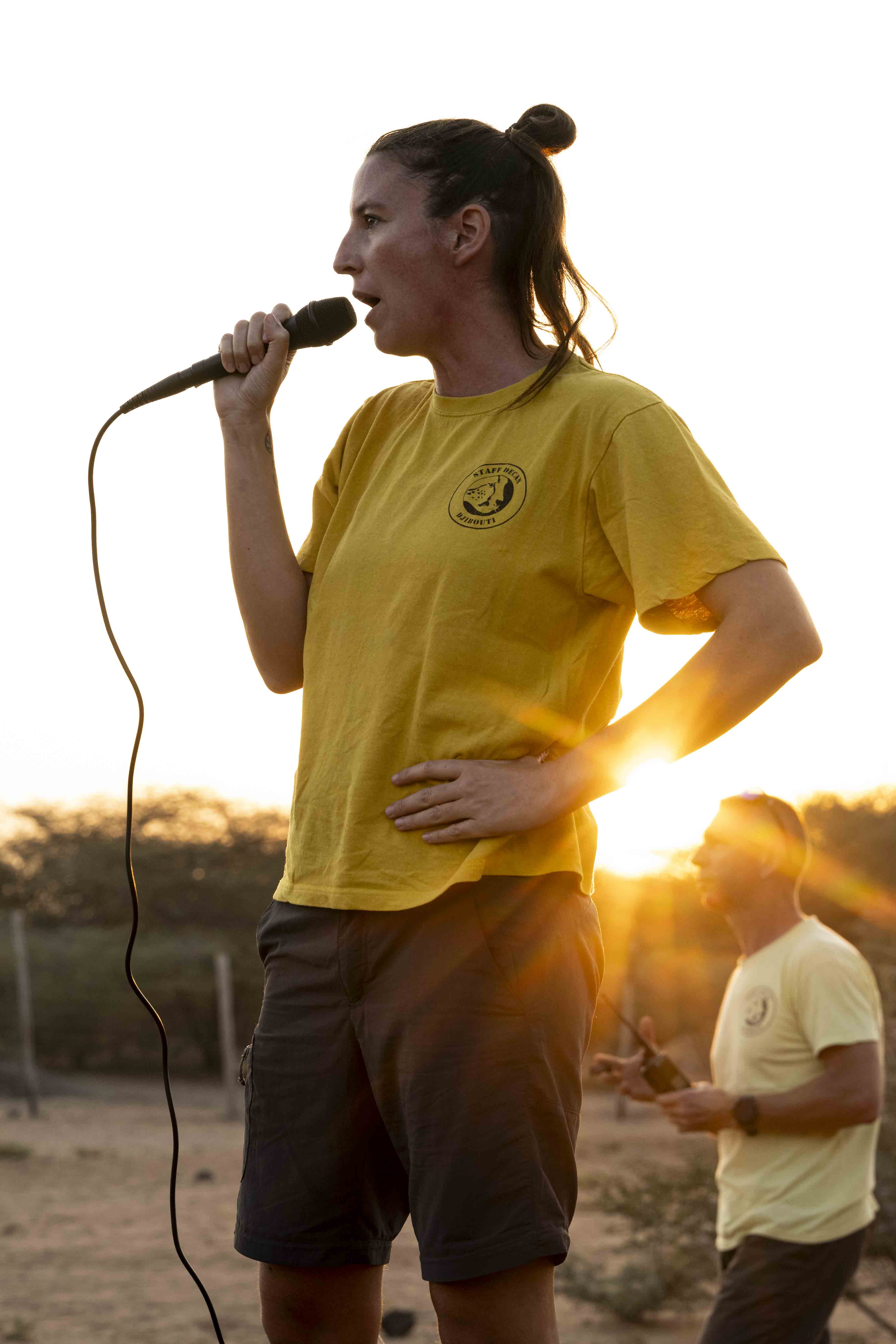 A Decan Wildlife Refuge volunteer gives a speech for the Cross du Refuge Décan 10k at the Decan Wildlife Refuge, Djibouti, Jan. 31, 2025. The Refuge’s mission is to protect endangered animals, release them when possible, and currently has more than 100 species. (U.S. Air Force photo by Airman 1st Class Joseph Bartoszek)