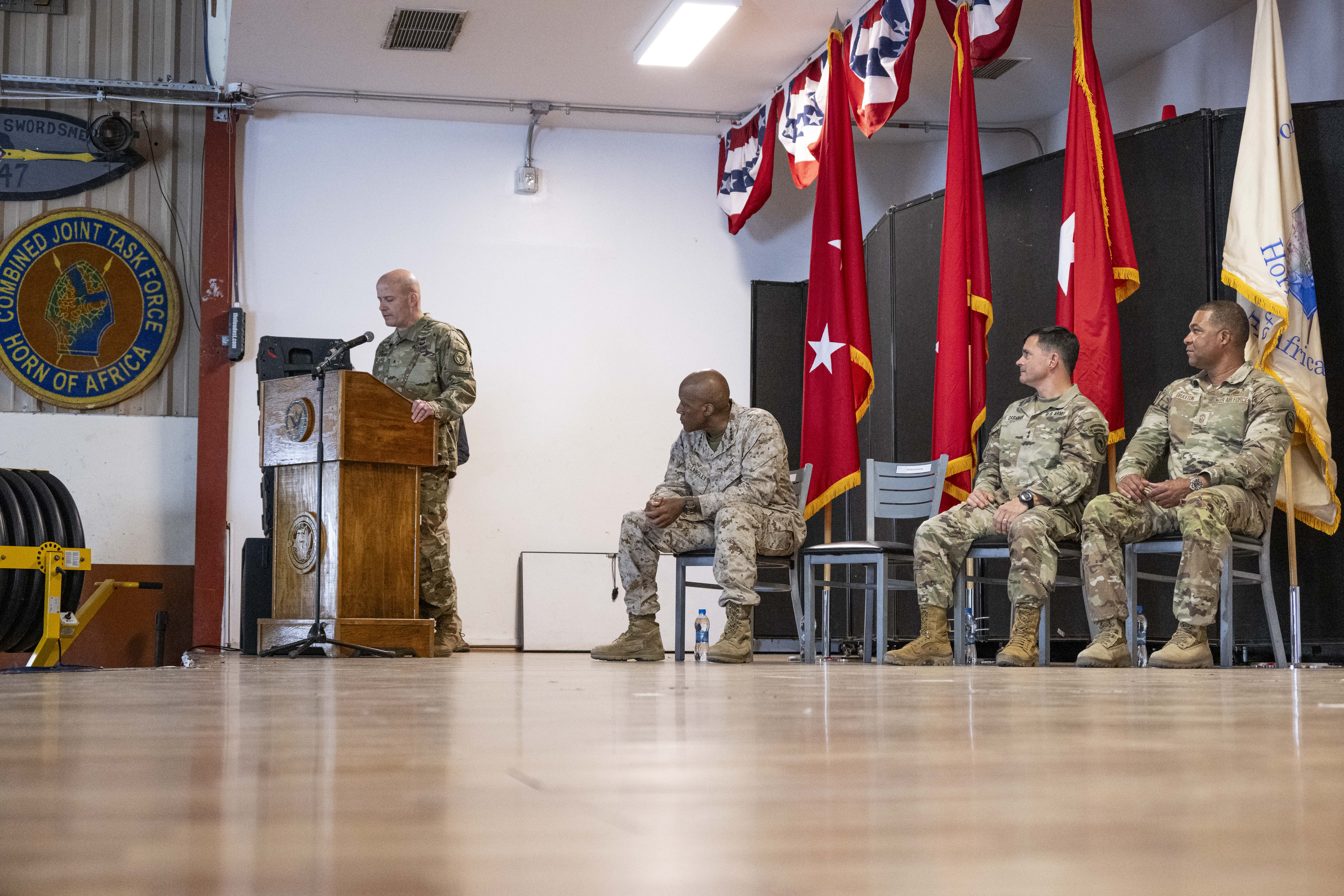 U.S. Marine Corps Gen. Michael Langley, commander of U.S. Africa Command, delivers a speech during the Combined Joint Task Force - Horn of Africa change-of-command ceremony at Camp Lemonnier, Djibouti, June 19, 2025. Composed of multiple U.S. military branches and coupled with foreign armed service personnel from various allied and partner nations, CJTF-HOA conducts operations to enhance partner nation capacity, promote regional stability, dissuade conflict and protect U.S. and partner interests. (U.S. Army photo by Spc. Micheala Maldonado)