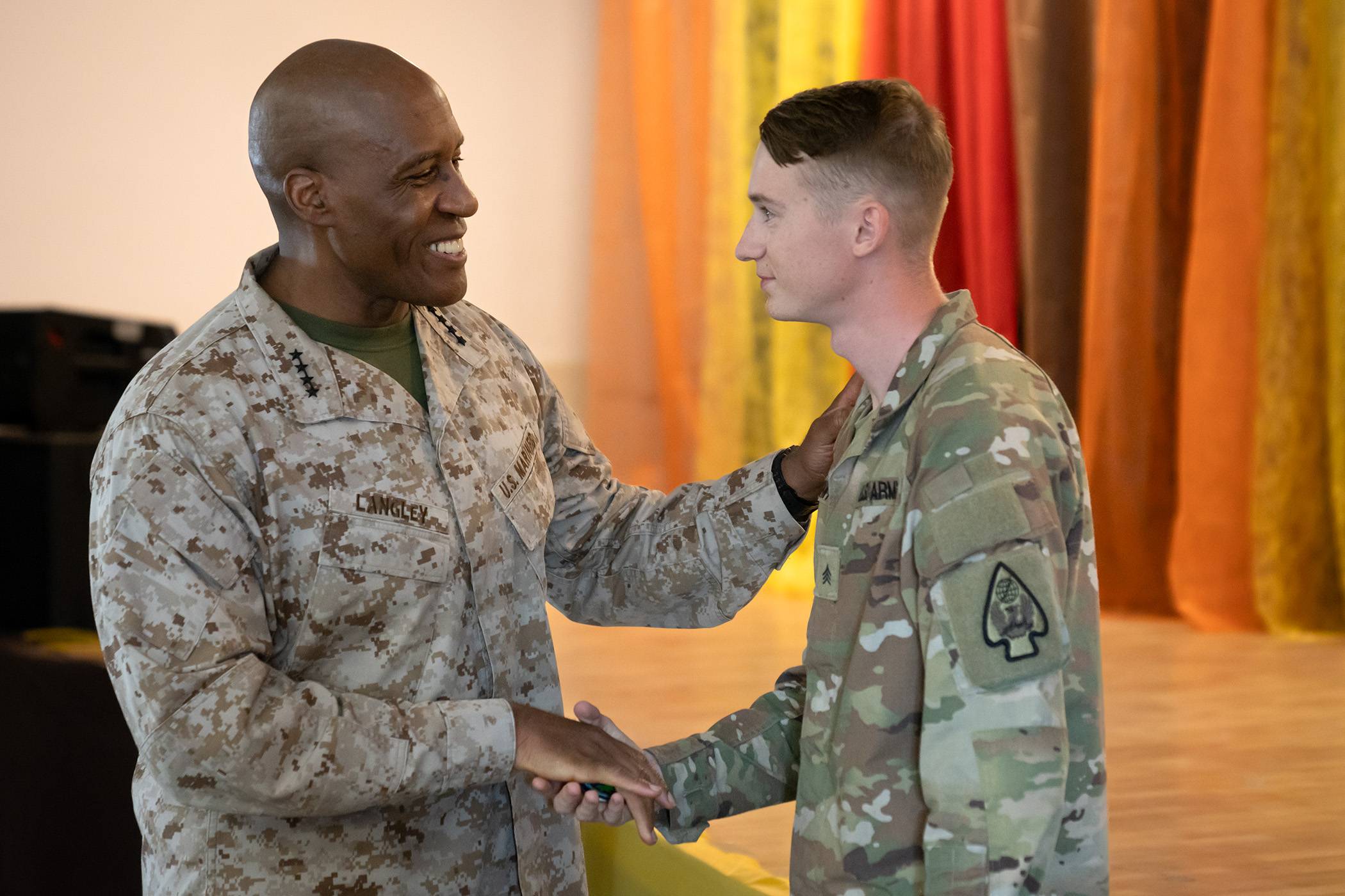 U.S. Marine Corps Gen. Michael Langley, U.S. Africa Command commander, coins U.S. Army SGT Cyle Smith, 3-58th Airfield Operations Battalion, on Camp Lemonnier, Djibouti Nov. 22, 2023. While visiting Camp Lemonnier, Langley recognized outstanding performers, attended an annual Djibouti Bowl flag football game, and served Thanksgiving meals to junior service members deployed in the Horn of Africa. (Department of Defense photo by U.S. Air Force Staff Sgt. Dylan Gentile)