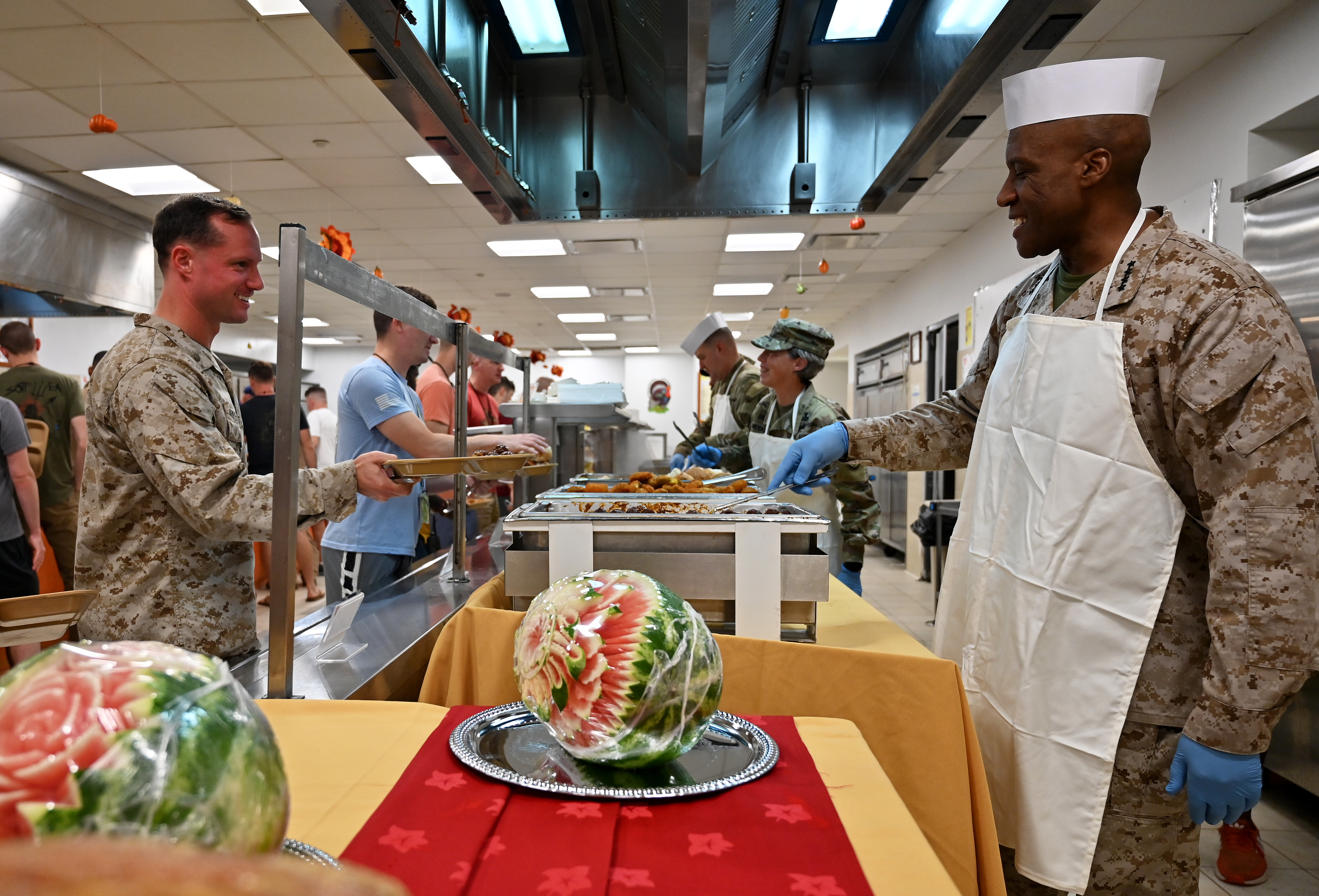 U.S. Marine Corps Gen. Michael Langley, commander of U.S. Africa Command, serves a Thanksgiving meal to service members deployed to Camp Lemonnier, Djibouti, Nov. 23, 2023. While visiting Camp Lemonnier, Langley presented awards to service members, attended a Turkey Bowl flag football game, and met with troops who are spending a holiday away from home. (Department of Defense photo by U.S. Air Force Master Sgt. Jerilyn Quintanilla)