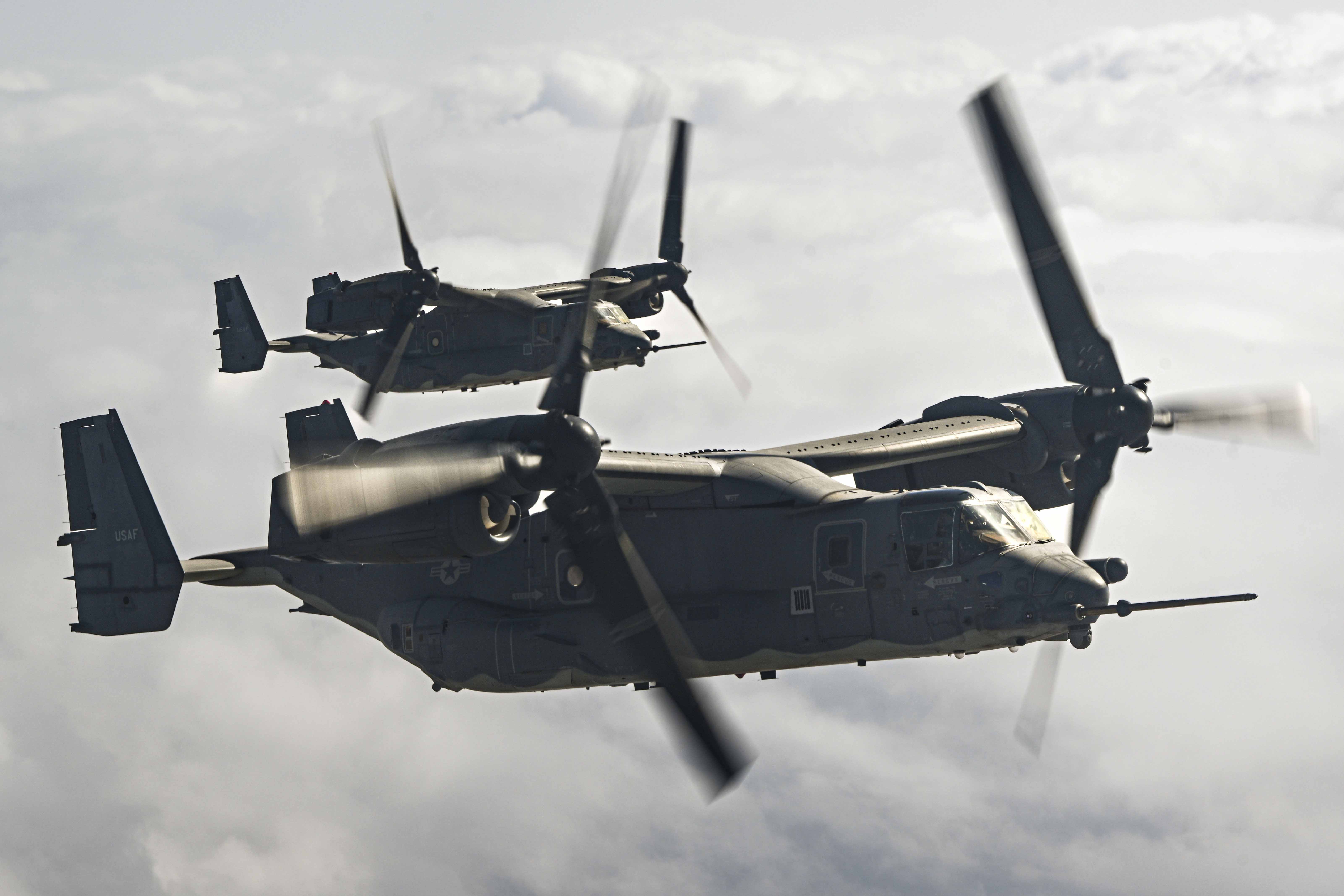 U.S. Air Force CV-22 Ospreys conduct a routine aerial refueling mission with Marine Medium Tiltrotor Squadron (VMM) 161 (Reinforced) in East Africa, June 2, 2025. Combined Joint Task Force - Horn of Africa stands ready to respond to crises across the continent, protecting and securing U.S. citizens and interests. (U.S. Air Force photo by Senior Airman Joseph Bartoszek)