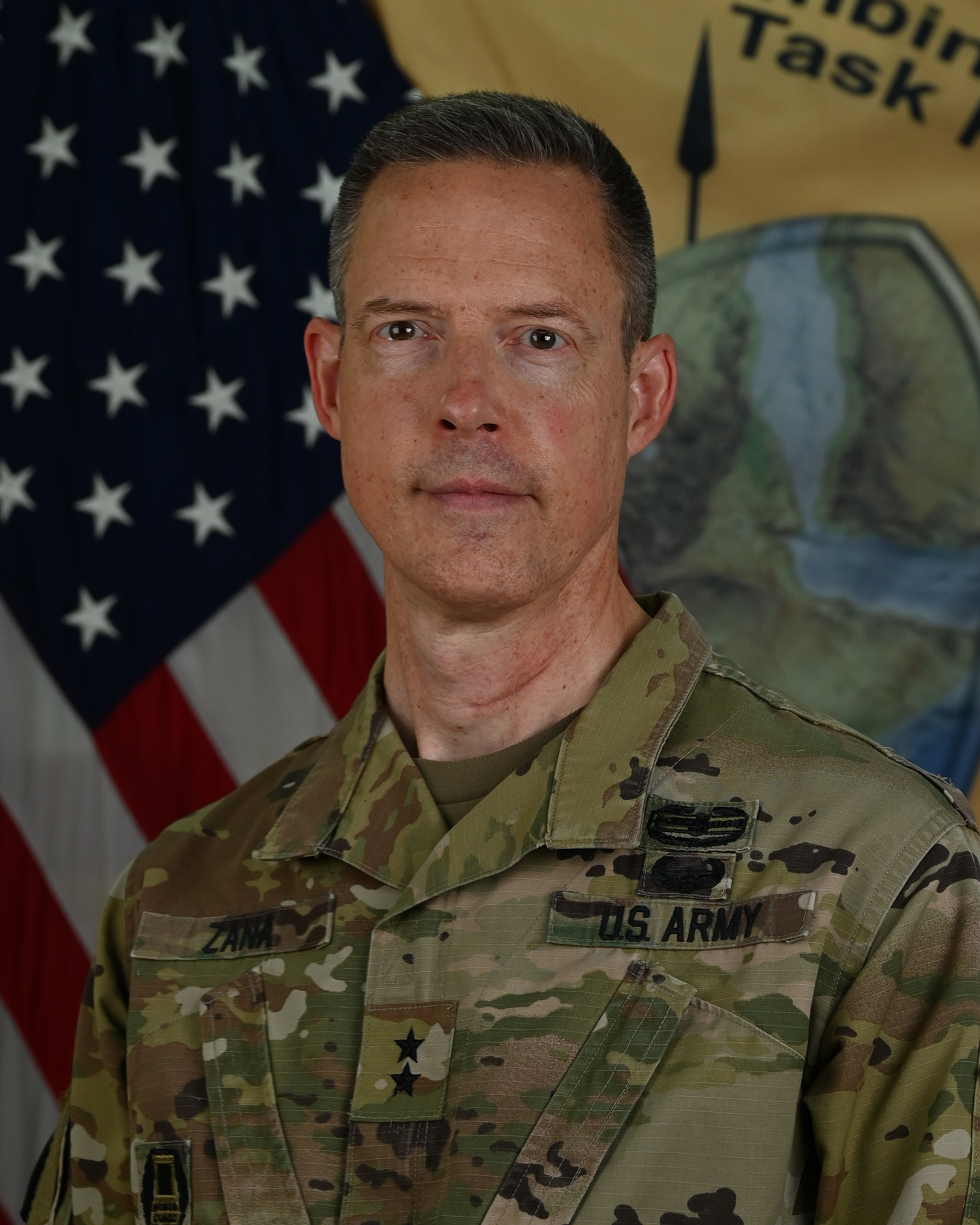 U.S. Army Maj. Gen. William L. Zana, in-coming commander, speaks to the audience during his change of command ceremony at Camp Lemonnier, Djibouti, May 15, 2021. Zana expressed his appreciation for being able to once again join the CJTF-HOA team and our allied nations. (U.S. Air Force photo by Master Sergeant Grady Epperly)