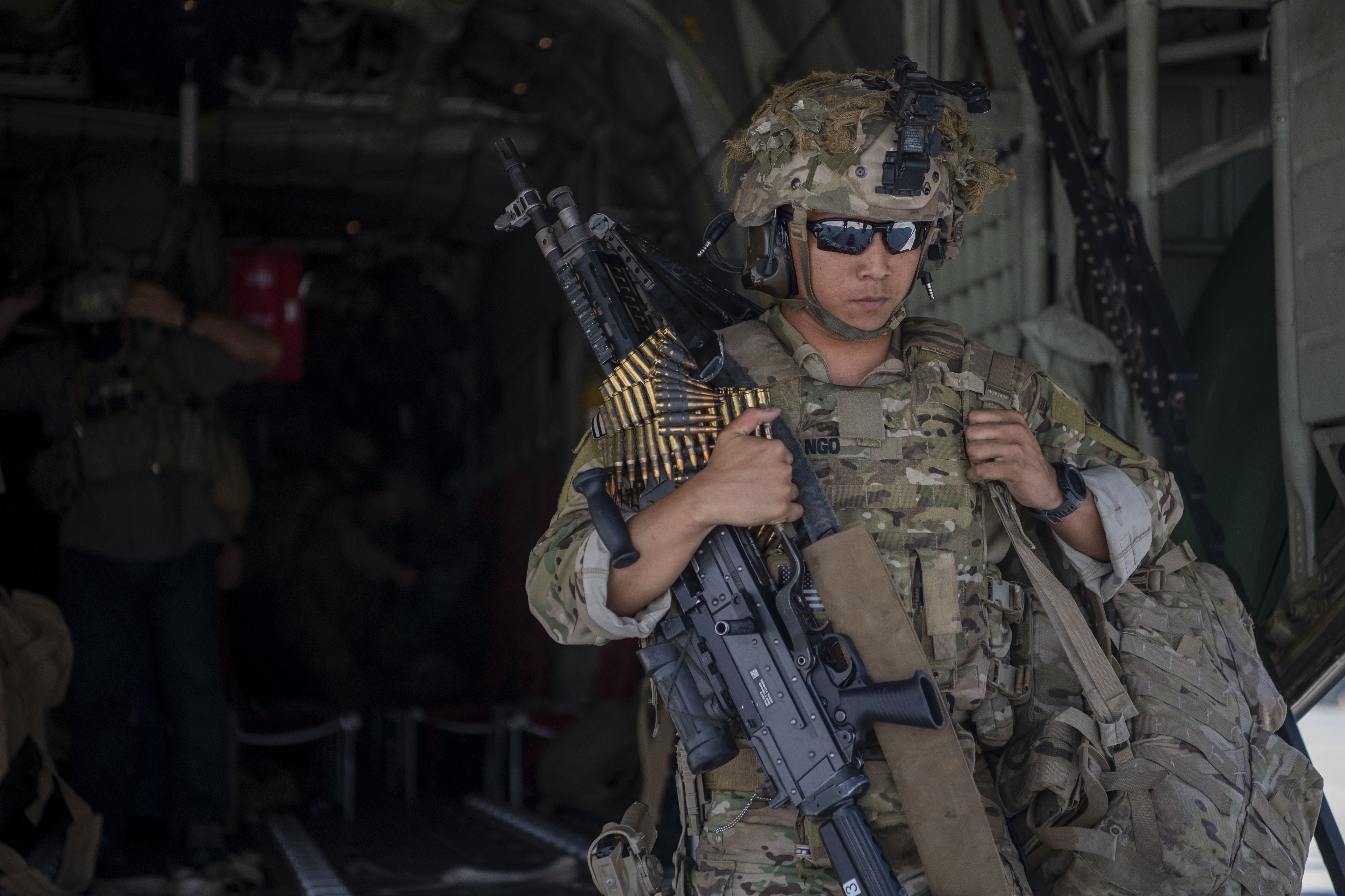 U.S. Army soldiers from the East African Response Force (EARF) assigned to the Combined Joint Task Force - Horn of Africa (CJTF-HOA) walk towards a C-130J Super Hercules Jan. 21, 2021, in Somalia. The EARF is a rapid deployment force with the ability to protect U.S. citizens and diplomatic facilities, provide non-combatant evacuation operations, humanitarian assistance, and disaster relief operations, on the African continent. (U.S. Air Force photo by Senior Airman Charles T. Fultz)