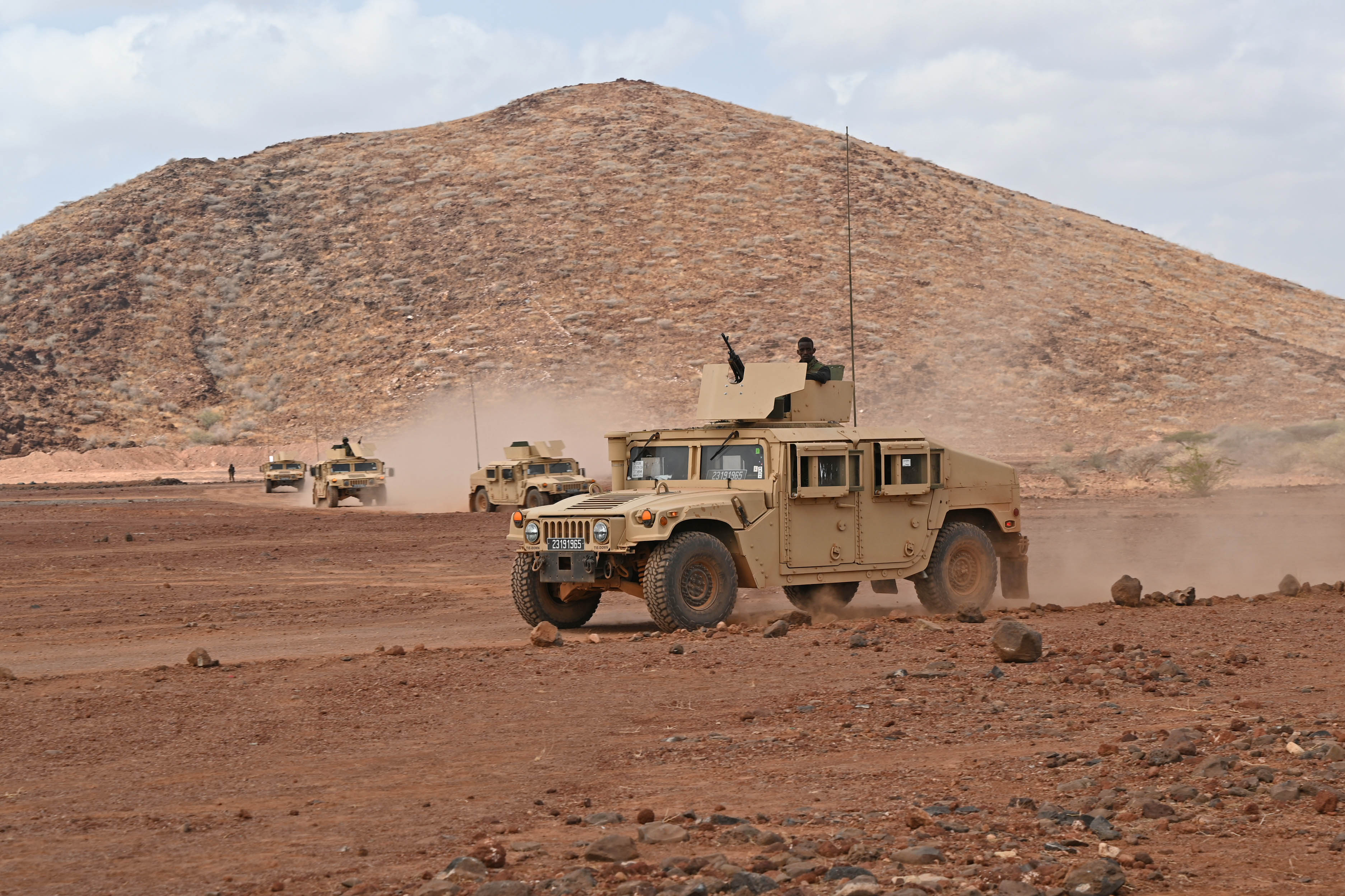 U.S. Army Maj. Gen. Joel K. Tyler, J-3 operations and cyber director, U.S. Arica Command meets with Djiboutian Col. Dahir Hassan Abadid, commander of Armored Regiment and Djiboutian Maj. Mohamed Assowen, commander of the Rapid Intervention Battalion (RIB) while watching a live-fire exercise conducted by the RIB, Sept. 28, 2020. The RIB’s mission is to serve as a reactionary force to accomplish specific tasks directed by their higher command in the Djiboutian army. (U.S. Air Force photo by Staff Sgt. Dana J. Cable)