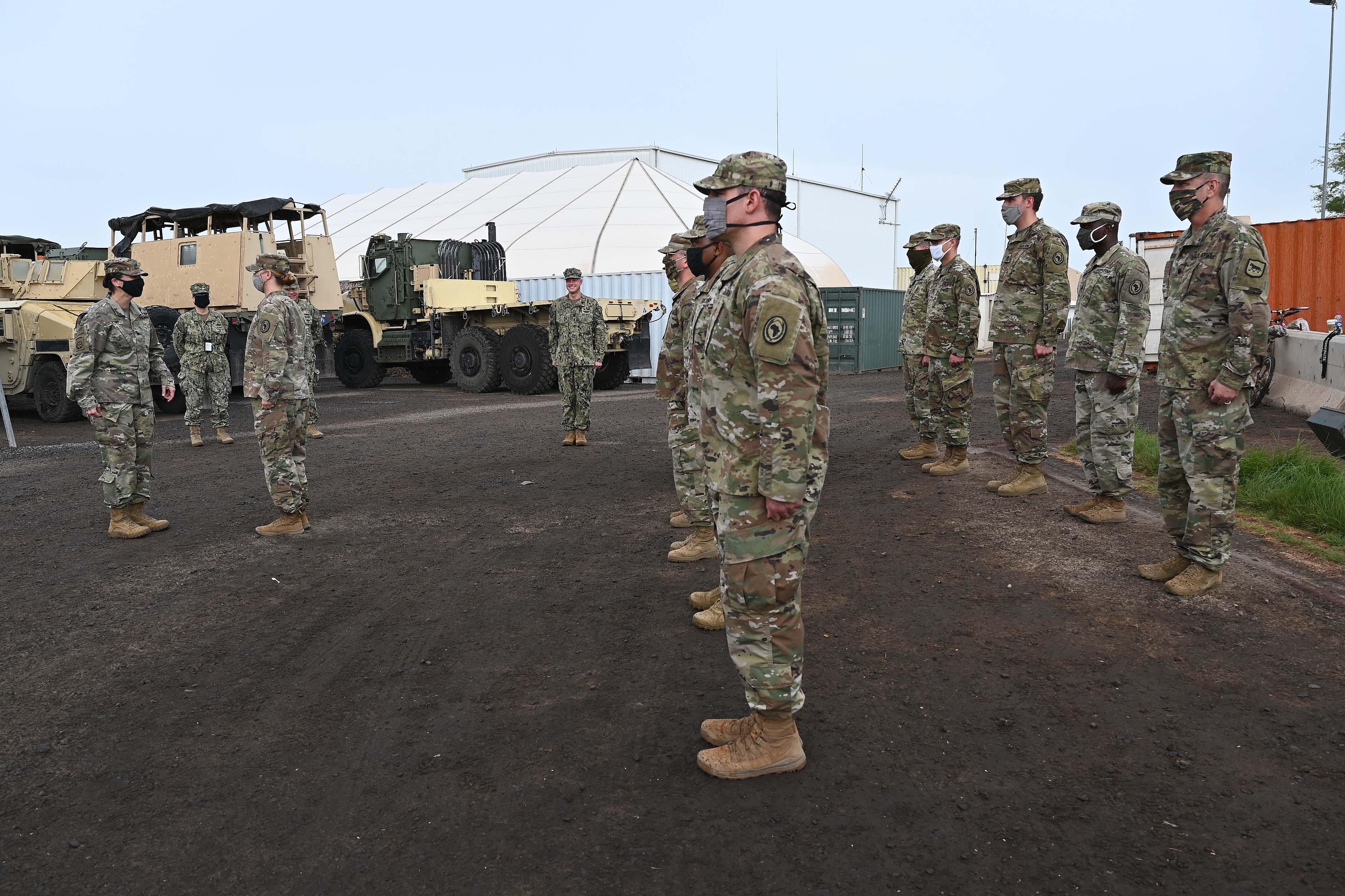U.S. Army soldiers assigned to Combined Joint Task Force-Horn of Africa (CJTF-HOA) are presented with the U.S. Africa Command combat patch during a ceremony at Camp Lemonnier, Djibouti, Sept. 9, 2020. The combat patch distinguishes soldiers who have deployed to a combat zone, and is worn on the right shoulder, opposite the higher headquarters unit patch. (U.S. Air Force photo by Staff Sgt. Dana J. Cable)