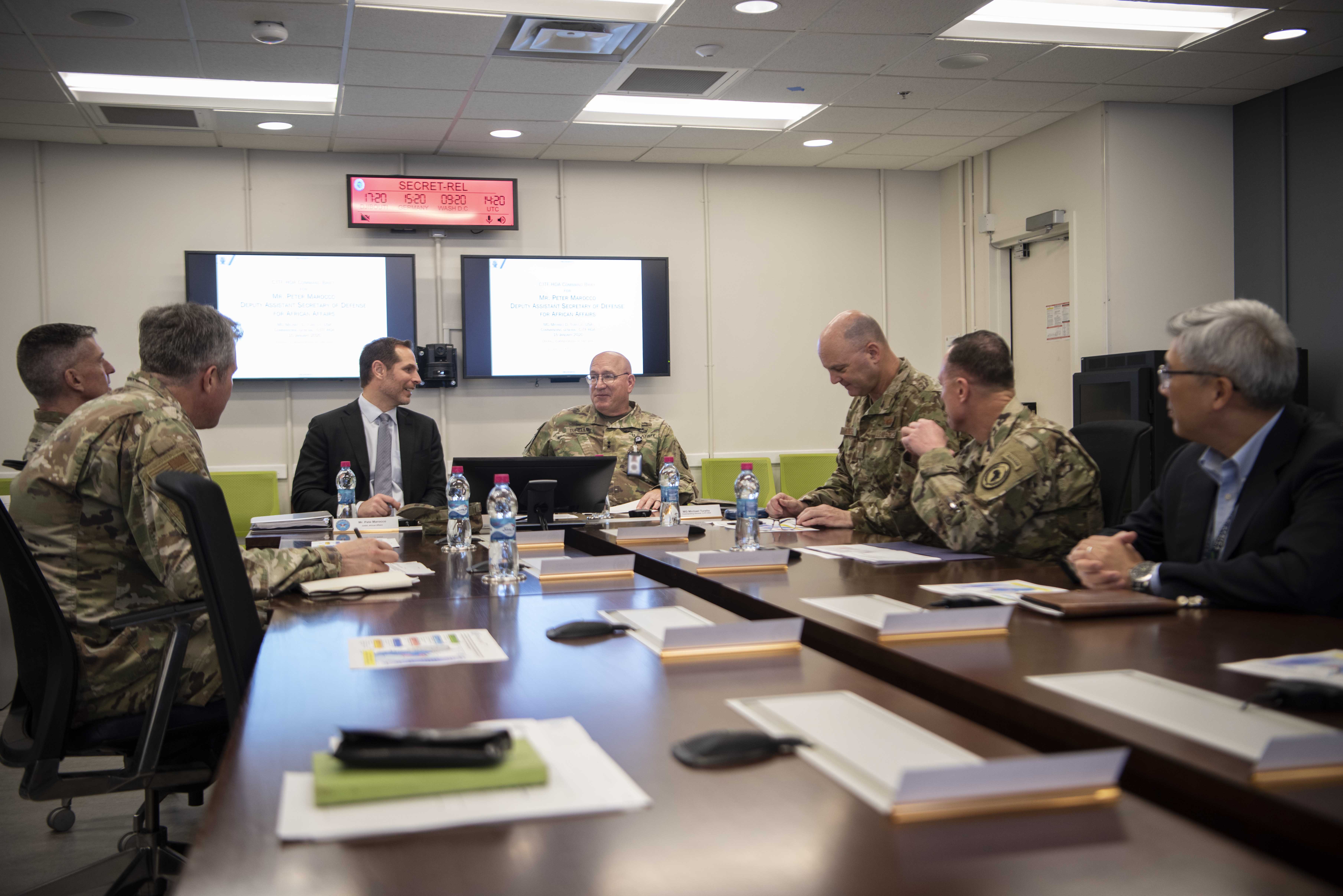 From left, U.S. Army Command Sgt. Maj. Shawn Carns, command senior enlisted leader (CSEL), Combined Joint Task Force-Horn of Africa (CJTF-HOA), U.S. Army Maj. Gen. Michael Turello, commanding general, CJTF-HOA, U.S. Navy Vice Adm. Luke McCollum, commander, Navy Reserve Force, chief, Navy Reserve, U.S. Navy Rear Adm. Endel Lee, deputy chief of chaplains, Reserve Matters, and U.S. Navy Master Chief Christopher Kotz, force master chief, Navy Reserve, pose for a group photo at Camp Lemonnier, Djibouti, Nov. 29, 2019. McCollum visited Camp Lemonnier to meet with deployed Navy Reserve sailors and other service members. (U.S. Air Force photo by Staff Sgt. J.D. Strong II)